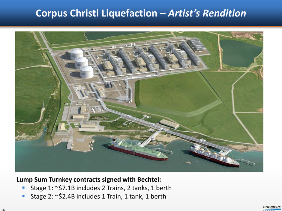 Key Differences Between CCL and SPL Grassroots construction at CCL; SPL utilizes existing assets at the regasification terminal Full containment LNG storage tanks at CCL instead of single containment Dry low emissions (DLE) combustors on refrigeration gas turbines rather than water injection (SAC combustors) Better soils at CCL; no piling needed on shore CCL will import electrical power from the local grid; SPL self generates power No LNG regasification capacity initially at CCL (although permitted) 15
