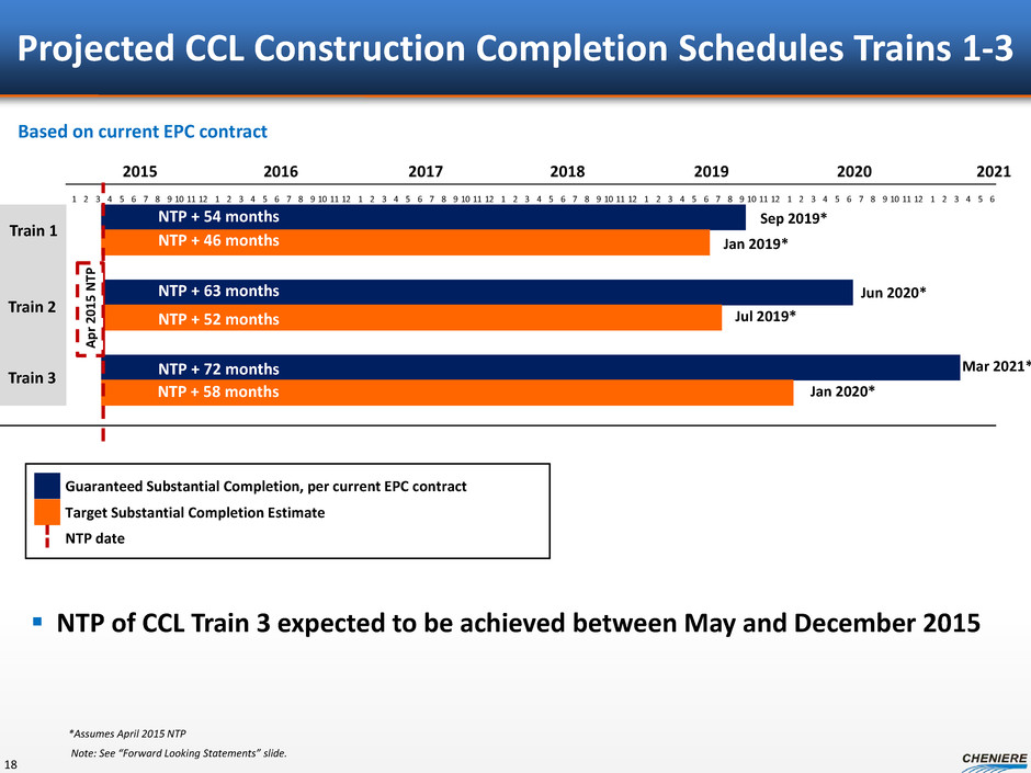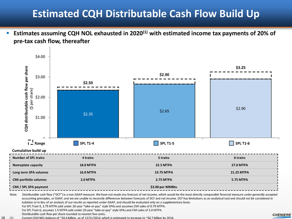 $2.95 $3.30 $3.65 $3.15 $3.60 $4.05 – $1.00 $2.00 $3.00 $4.00 CQ P di st ri bu ta bl e ca sh fl ow p er u ni t ($ p er u ni t) Estimated CQP Distributable Cash Flow Build Up 17 Note: Distributable cash flow (“DCF”) is a non-GAAP measure. We have not made any forecast of net income, which would be the most directly comparable financial measure under generally accepted accounting principles, or GAAP, and we are unable to reconcile differences between forecasts of DCF and net income. DCF has limitations as an analytical tool and should not be considered in isolation or in lieu of an analysis of our results as reported under GAAP, and should be evaluated only on a supplementary basis. For SPL Train 5, 3.75 MTPA sold under 20-year “take-or-pay” style SPAs and assumes CMI sales of 0.75 MTPA. For SPL Train 6, assumes 1.5 MTPA sold under 20-year “take-or-pay” style SPAs and CMI sales of 3.0 MTPA. Distributable cash flow per unit rounded to nearest five cents. Number of SPL trains 4 trains 5 trains 6 trains Nameplate capacity 18.0 MTPA 22.5 MTPA 27.0 MTPA Long term SPA volumes 16.0 MTPA 19.75 MTPA 21.25 MTPA CMI portfolio volumes 2.0 MTPA 2.75 MTPA 5.75 MTPA CMI / SPL SPA payment $3.00 per MMBtu Cumulative build up SPL T1-4 SPL T1-5 SPL T1-6 Range