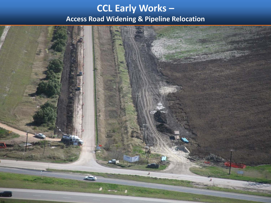 2015 2016 2017 2018 2019 2020 2021 1 2 3 4 5 6 7 8 9 10 11 12 1 2 3 4 5 6 7 8 9 10 11 12 1 2 3 4 5 6 7 8 9 10 11 12 1 2 3 4 5 6 7 8 9 10 11 12 1 2 3 4 5 6 7 8 9 10 11 12 1 2 3 4 5 6 7 8 9 10 11 12 1 2 3 4 5 6 Projected CCL Construction Completion Schedules Trains 1-3 18 Note: See “Forward Looking Statements” slide. A pr 2 01 5 N TP Sep 2019* Jan 2019* Jul 2019* Jun 2020* Jan 2020* Mar 2021* NTP + 54 months NTP + 46 months NTP + 63 months NTP + 52 months NTP + 72 months NTP + 58 months Guaranteed Substantial Completion, per current EPC contract Target Substantial Completion Estimate NTP date NTP of CCL Train 3 expected to be achieved between May and December 2015 *Assumes April 2015 NTP 2015 2016 2017 2018 2019 2020 2021 Train 1 Train 2 Train 3 Based on current EPC contract
