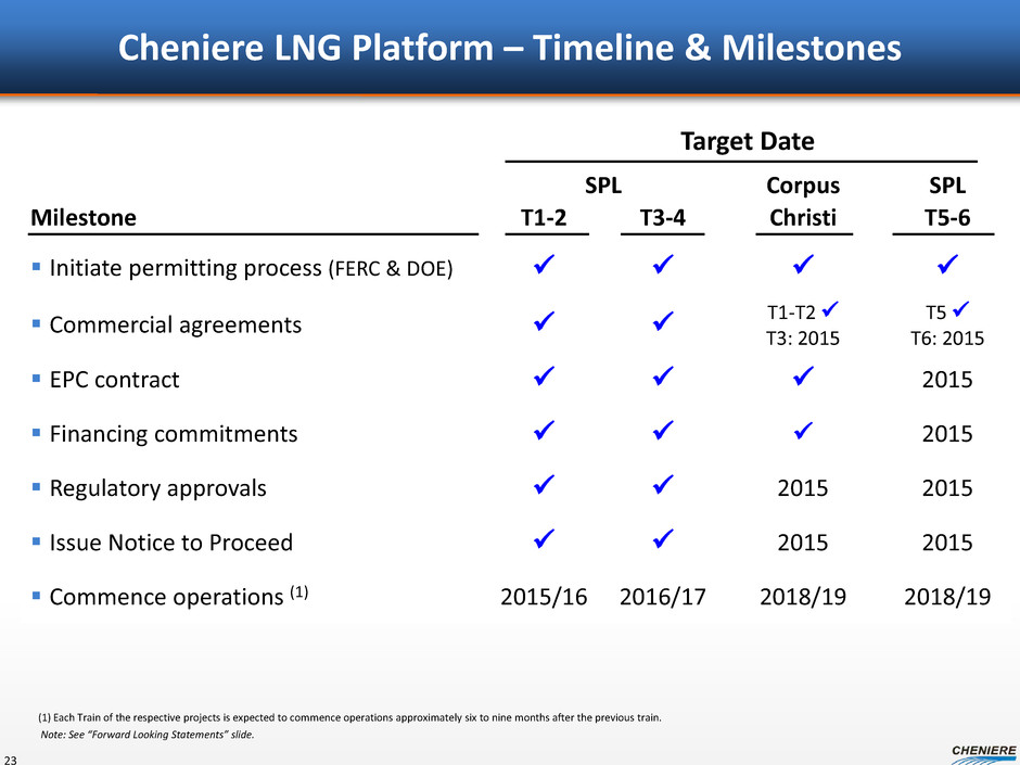 Potential Financial Profile of CEI 22 Note: EBITDA is a non-GAAP measure. EBITDA is computed as total revenues less non-cash deferred revenues, operating expenses, assumed commissioning costs and state and local taxes. It does not include depreciation expenses and certain non-operating items. Because we have not forecasted depreciation expense and non-operating items, we have not made any forecast of net income, which would be the most directly comparable financial measure under generally accepted accounting principles, or GAAP, and we are unable to reconcile differences between forecasts of EBITDA and net income. EBITDA has limitations as an analytical tool and should not be considered in isolation or in lieu of an analysis of our results as reported under GAAP, and should be evaluated only on a supplementary basis. (1) Includes accretion of initial EIG Note of $1.5 billion for 6 years. (2) Includes $625 million of Convertible Notes due 2045, plus accretion of initial RRJ Note of $1.0 billion for 6.5 years. (3) As of January 29, 2015, 236.7 million shares outstanding. (4) Present value of tax savings from current NOL balance plus forecasted NOL additions at 10% discount rate, as of March 2015. Current CEI NOL balance of ~$2.5 billion, as of 12/31/2014, which is estimated to increase to ~$3.1 billion by 2016. 9 Trains 11 Trains CEI EBITDA range $3.7 - $5.1 billion $5.2 - $6.9 billion CEI debt ~$16.3 billion ~$23.8 billion CCL Trains 1-3 (Project level) ~$11.5 billion ~$11.5 billion Additional 2-train expansion (Project level) ─ ~$7.5 billion EIG Note(1) ~$2.8 billion ~$2.8 billion Convertible debt(2) ~$2.0 billion ~$2.0 billion CEI share count(3) ~237 million ~237 million PV10 of tax savings related to NOLs(4) $0.7 - $0.8 billion