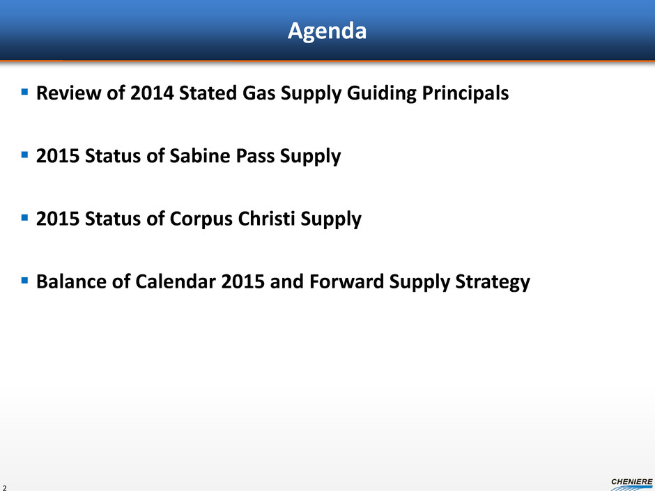 Agenda Review of 2014 Stated Gas Supply Guiding Principals 2015 Status of Sabine Pass Supply 2015 Status of Corpus Christi Supply Balance of Calendar 2015 and Forward Supply Strategy 2