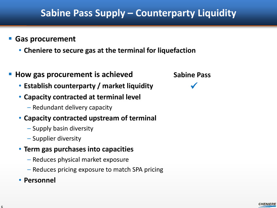Summary Organizational Structure Cheniere Energy, Inc. (NYSE MKT: LNG) Cheniere Energy Partners, L.P. (NYSE MKT: CQP) Sabine Pass LNG, L.P. (SPLNG) Total TUA (1 Bcf/d) Chevron TUA (1 Bcf/d) SPL TUA (2 Bcf/d) Sr Secured Notes $1,666 due 2016 (7.50%) $420 due 2020 (6.50%) ($ in millions) Cheniere Marketing, LLC (CMI) Trains 1-4 Debt $900 Credit Facilities due 2020(1) $2,000 Notes due 2021 (5.625%) $1,000 Notes due 2022 (6.250%) $1,500 Notes due 2023 (5.625%) $2,000 Notes due 2024 (5.750%) $2,000 Notes due 2025 (5.625%) Sabine Pass Liquefaction, LLC (SPL) Creole Trail Pipeline (CTPL) $400 Term Loan due 2017 (L+325) CQP GP (& IDRs) (1) Includes $671 million term loan facility, $165 million Republic of Korea (“ROK”) covered facility and $64 million ROK direct facility. Interest on the term loan facility is L+300 during construction and steps up to L+325 during operation. Under the ROK credit facilities, interest includes L+300 on the direct portion and L+230 on the covered portion during construction and operation. In addition, SPL will pay 100 bps for insurance/guarantee premiums on any drawn amounts under the covered tranches. These Credit Facilities mature on the earlier of May 28, 2020 or the second anniversary of Train 4 completion date. (2) Assumes final investment decision (“FID”) made on CCL Trains 1-3. Note: CCH and CCH HoldCo entity detail not fully shown in diagram. Cheniere Energy Partners LP Holdings, LLC (NYSE MKT: CQH) 5 Cheniere CCH Holdco II, LLC Convertible Debt $1,000 PIK Convertible Notes due 2021 (4.875%) $625 Convertible Notes due 2045 (4.250%) SPL Firm Transport (1.5 Bcf/d) BG SPA (286.5 Tbtu / yr) Gas Natural SPA (182.5 Tbtu / yr) KOGAS SPA (182.5 Tbtu / yr) GAIL (182.5 Tbtu / yr) Total (104.8 Tbtu / yr) Centrica (91.3 Tbtu / yr) CMI SPA Pertamina SPA (79.4 Tbtu / yr) Endesa SPA (117.3 Tbtu / yr) Iberdrola SPA (39.7 Tbtu / yr) Gas Natural (78.2 Tbtu / yr) Woodside (44.1 Tbtu / yr) EDF (40.0 Tbtu / yr) EDP (40.0 Tbtu / yr) CMI SPA Cheniere Corpus Christi Holdings, LLC (CCH) Trains 1-3 Equity(2) $1,500 Senior Secured Convertible Notes due 2025 Trains 1-3 Debt(2) ~$11,500 Credit Facilities due 2022 Corpus Christi Liquefaction, LLC (CCL)