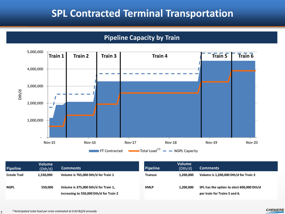Sabine Pass Supply – Counterparty Liquidity 6 Sabine Pass Gas procurement • Cheniere to secure gas at the terminal for liquefaction How gas procurement is achieved • Establish counterparty / market liquidity • Capacity contracted at terminal level – Redundant delivery capacity • Capacity contracted upstream of terminal – Supply basin diversity – Supplier diversity • Term gas purchases into capacities – Reduces physical market exposure – Reduces pricing exposure to match SPA pricing • Personnel