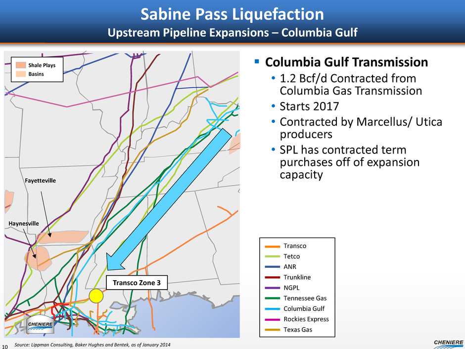 Sabine Pass Liquefaction Upstream Pipeline Expansions – Texas Gas Texas Gas • Almost 1 Bcf/d Contracted • Starts late 2016/ early 2017 • Contracted by Utica producers • SPL owns 300,000 Dth/d 9 Source: Lippman Consulting, Baker Hughes and Bentek, as of January 2014 Haynesville Fayetteville Lebanon Transco Zone 3 Transco Tetco ANR Trunkline NGPL Tennessee Gas Columbia Gulf Rockies Express Texas Gas Shale Plays Basins Haynesville