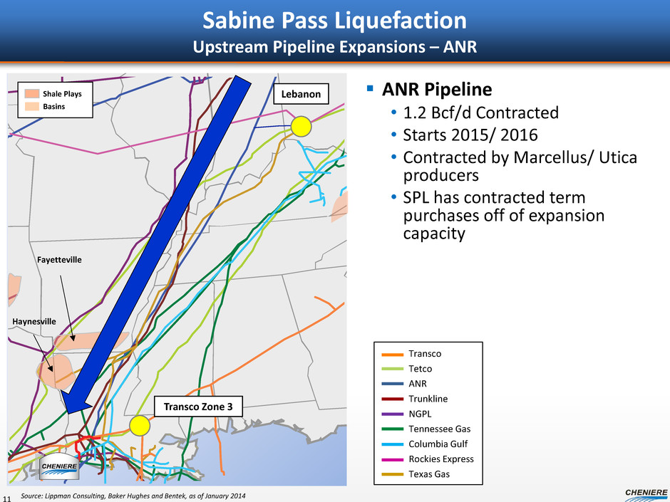 Sabine Pass Liquefaction Upstream Pipeline Expansions – Columbia Gulf Columbia Gulf Transmission • 1.2 Bcf/d Contracted from Columbia Gas Transmission • Starts 2017 • Contracted by Marcellus/ Utica producers • SPL has contracted term purchases off of expansion capacity 10 Haynesville Fayetteville Transco Zone 3 Transco Tetco ANR Trunkline NGPL Tennessee Gas Columbia Gulf Rockies Express Texas Gas Shale Plays Basins Source: Lippman Consulting, Baker Hughes and Bentek, as of January 2014 Haynesville