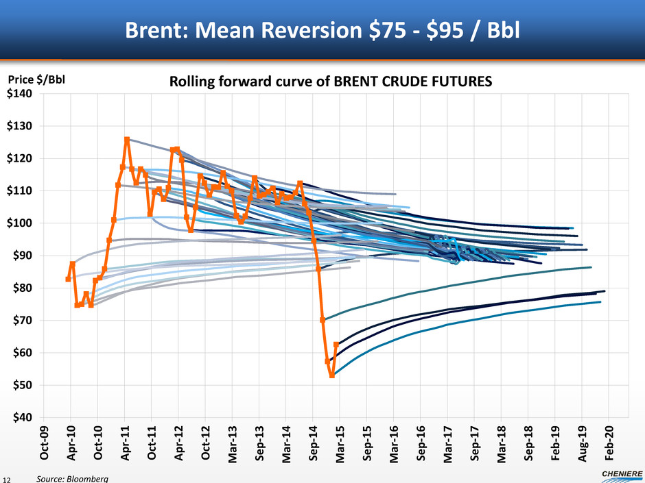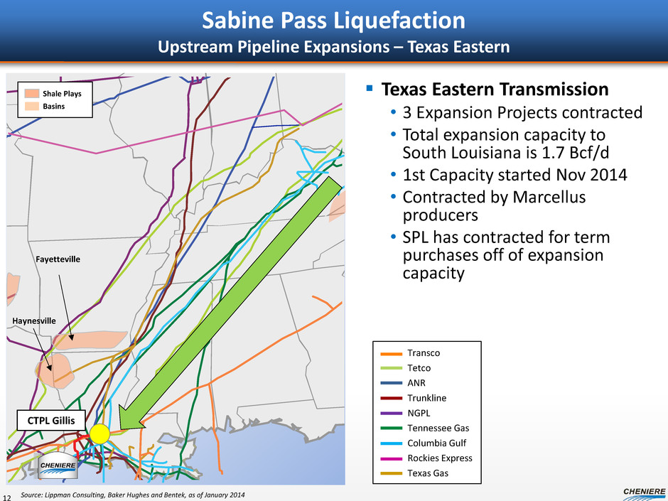 Sabine Pass Liquefaction Upstream Pipeline Expansions – ANR ANR Pipeline • 1.2 Bcf/d Contracted • Starts 2015/ 2016 • Contracted by Marcellus/ Utica producers • SPL has contracted term purchases off of expansion capacity 11 Transco Tetco ANR Trunkline NGPL Tennessee Gas Columbia Gulf Rockies Express Texas Gas Source: Lippman Consulting, Baker Hughes and Bentek, as of January 2014 Haynesville Fayetteville Lebanon Transco Zone 3 Shale Plays Basins Haynesville