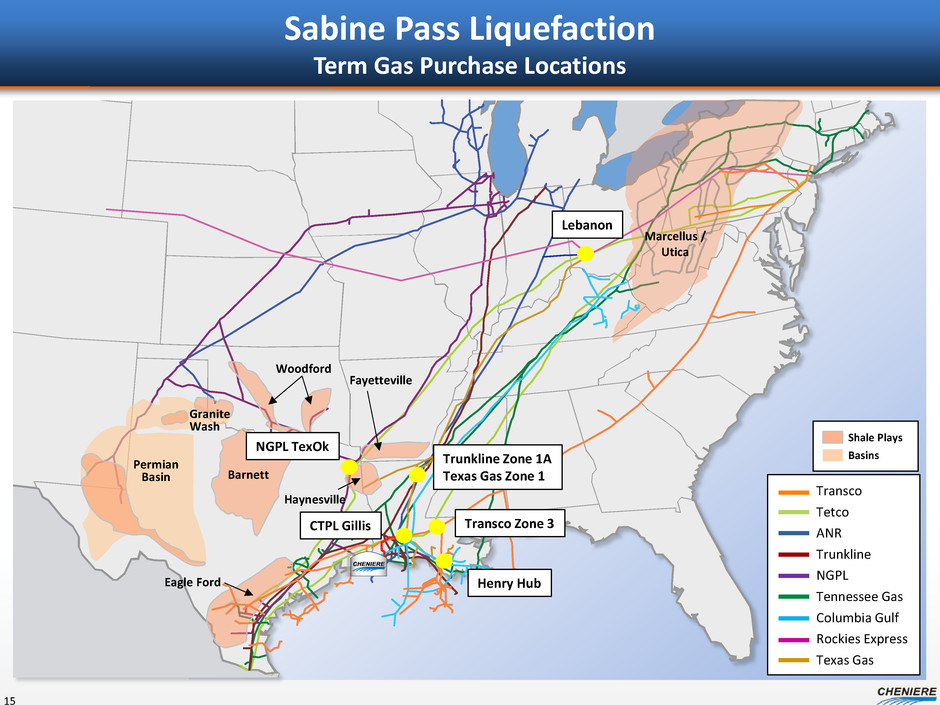 Sabine Pass Supply – Upstream Capacity 14 Sabine Pass Gas procurement • Cheniere to secure gas at the terminal for liquefaction How gas procurement is achieved • Establish counterparty / market liquidity • Capacity contracted at terminal level – Redundant delivery capacity • Capacity contracted upstream of terminal – Supply basin diversity – Supplier diversity • Term gas purchases into capacities – Reduces physical market exposure – Reduces pricing exposure to match SPA pricing • Personnel