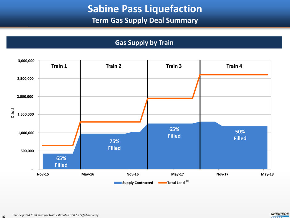 Sabine Pass Liquefaction Term Gas Purchase Locations 15 Permian Basin Barnett Granite Wash Eagle Ford Haynesville Woodford Fayetteville Marcellus / Utica Transco Tetco ANR Trunkline NGPL Tennessee Gas Columbia Gulf Rockies Express Texas Gas Shale Plays Basins Henry Hub Transco Zone 3 CTPL Gillis Trunkline Zone 1A Texas Gas Zone 1 NGPL TexOk Lebanon
