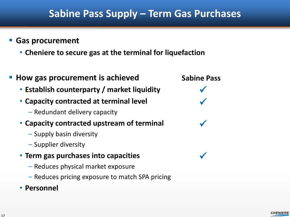 - 500 1,000 1,500 2,000 2,500 3,000 Nov-15 May-16 Nov-16 May-17 Nov-17 May-18 Supply Contracted Total Load 65% Filled 75% Filled 65% Filled 50% Filled Sabine Pass Liquefaction Term Gas Supply Deal Summary 16 Train 1 Train 2 Train 3 Train 4 (1)Anticipated total load per train estimated at 0.65 Bcf/d annually (1) 3,000,000 2,500,000 2,000,000 1,500,00 1,000 D th /d 500,0 Gas Supply by Train