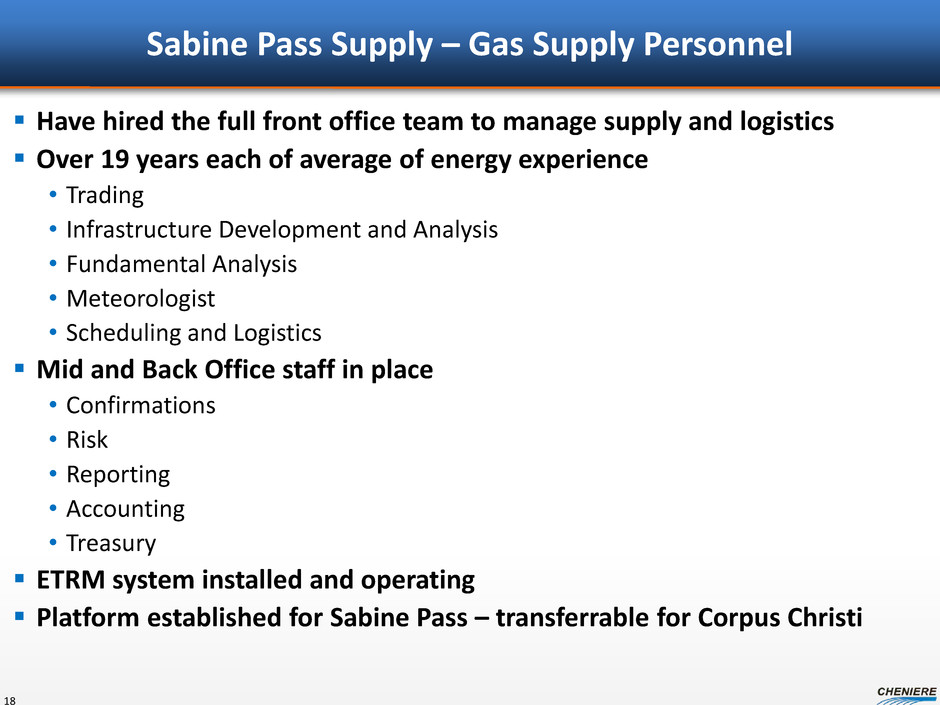 Sabine Pass Supply – Term Gas Purchases 17 Sabine Pass Gas procurement • Cheniere to secure gas at the terminal for liquefaction How gas procurement is achieved • Establish counterparty / market liquidity • Capacity contracted at terminal level – Redundant delivery capacity • Capacity contracted upstream of terminal – Supply basin diversity – Supplier diversity • Term gas purchases into capacities – Reduces physical market exposure – Reduces pricing exposure to match SPA pricing • Personnel