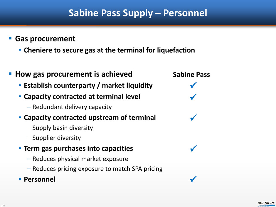 Sabine Pass Supply – Gas Supply Personnel Have hired the full front office team to manage supply and logistics Over 19 years each of average of energy experience • Trading • Infrastructure Development and Analysis • Fundamental Analysis • Meteorologist • Scheduling and Logistics Mid and Back Office staff in place • Confirmations • Risk • Reporting • Accounting • Treasury ETRM system installed and operating Platform established for Sabine Pass – transferrable for Corpus Christi 18