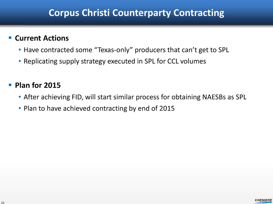 Corpus Christi Counterparty Contracting Current Actions • Have contracted some “Texas-only” producers that can’t get to SPL • Replicating supply strategy executed in SPL for CCL volumes Plan for 2015 • After achieving FID, will start similar process for obtaining NAESBs as SPL • Plan to have achieved contracting by end of 2015 21