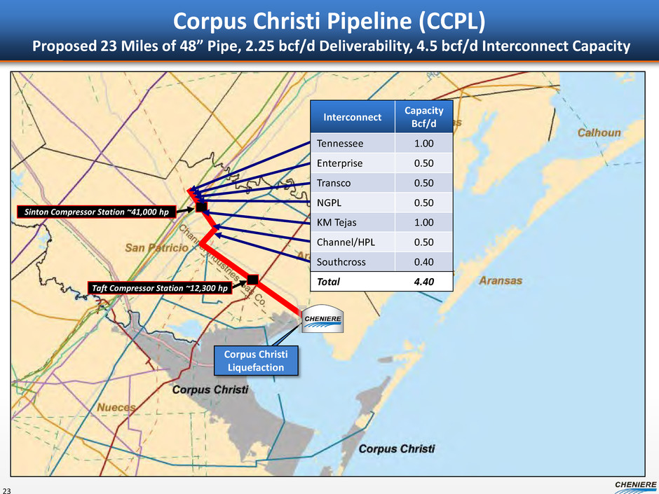Corpus Christi Supply - Contracting 22 Sabine Pass Corpus Christi Gas procurement • Cheniere to secure gas at the terminal for liquefaction How gas procurement is achieved • Establish counterparty / market liquidity • Capacity contracted at terminal level – Redundant delivery capacity • Capacity contracted upstream of terminal – Supply basin diversity – Supplier diversity • Term gas purchases into capacities – Reduces physical market exposure – Reduces pricing exposure to match SPA pricing • Personnel