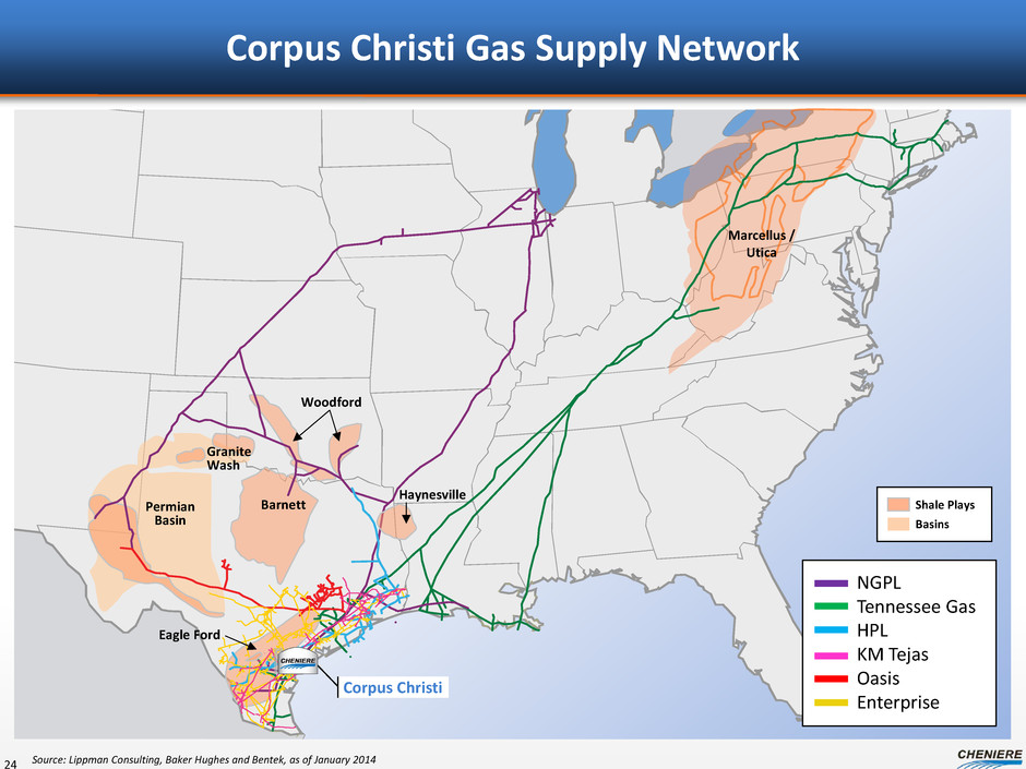 Corpus Christi Gas Supply Network 24 Shale Plays Basins NGPL Tennessee Gas HPL KM Tejas Oasis Enterprise Permian Basin Barnett Granite Wash Eagle Ford Haynesville Marcellus / Utica Corpus Christi Woodford Source: Lippman Consulting, Baker Hughes and Bentek, as of January 2014