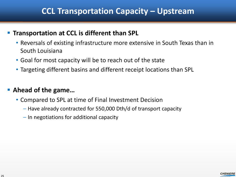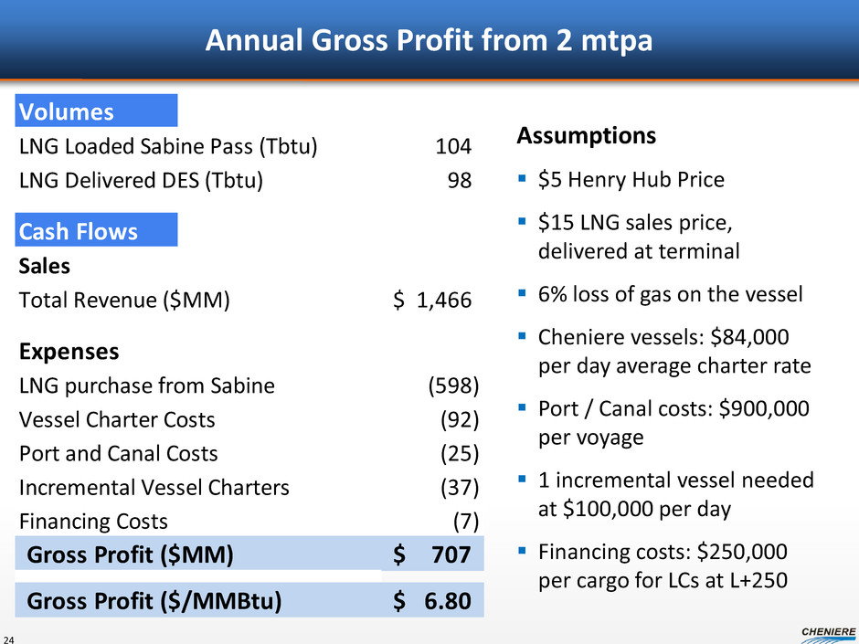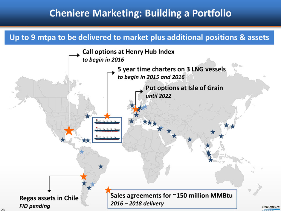Cheniere Marketing: Building a Portfolio Up to 9 mtpa to be delivered to market plus additional positions & assets 23 Call options at Henry Hub Index to begin in 2016 Put options at Isle of Grain until 2022 5 year time charters on 3 LNG vessels to begin in 2015 and 2016 Regas assets in Chile FID pending Sales agreements for ~150 million MMBtu 2016 – 2018 delivery