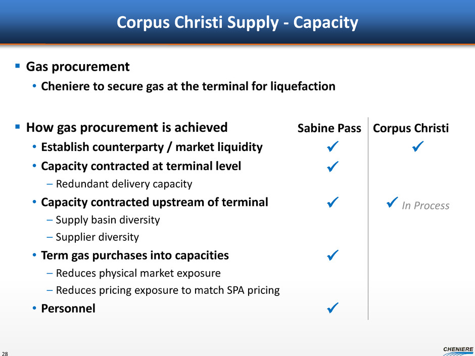 CCL Transportation Capacity Connections to CCL Pipeline Transportation at CCL is different than SPL • Reversals of existing infrastructure more extensive in South Texas than in South Louisiana • Goal for most capacity will be to reach out of the state • Targeting different basins and different receipt locations than SPL Ahead of the game… • Compared to SPL at time of Final Investment Decision – Have already contracted for 550,000 Dth/d of transport capacity – In negotiations for additional capacity • Compared to others with demand loads within Texas – LNG projects – Mexican demand – Industrial loads 27