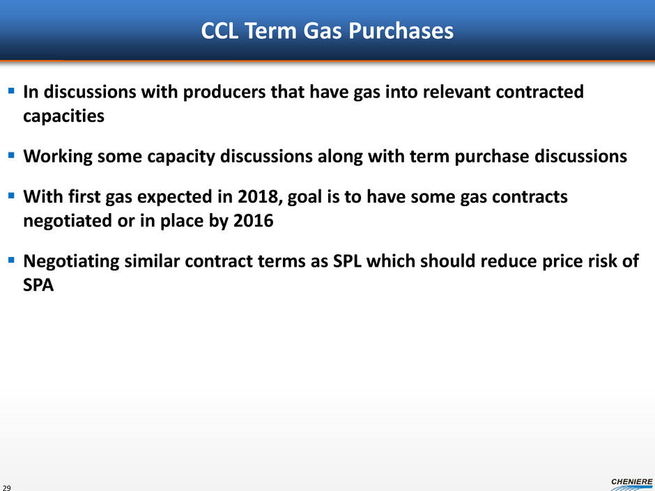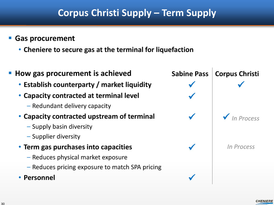 CCL Term Gas Purchases In discussions with producers that have gas into relevant contracted capacities Working some capacity discussions along with term purchase discussions With first gas expected in 2018, goal is to have some gas contracts negotiated or in place by 2016 Negotiating similar contract terms as SPL which should reduce price risk of SPA 29
