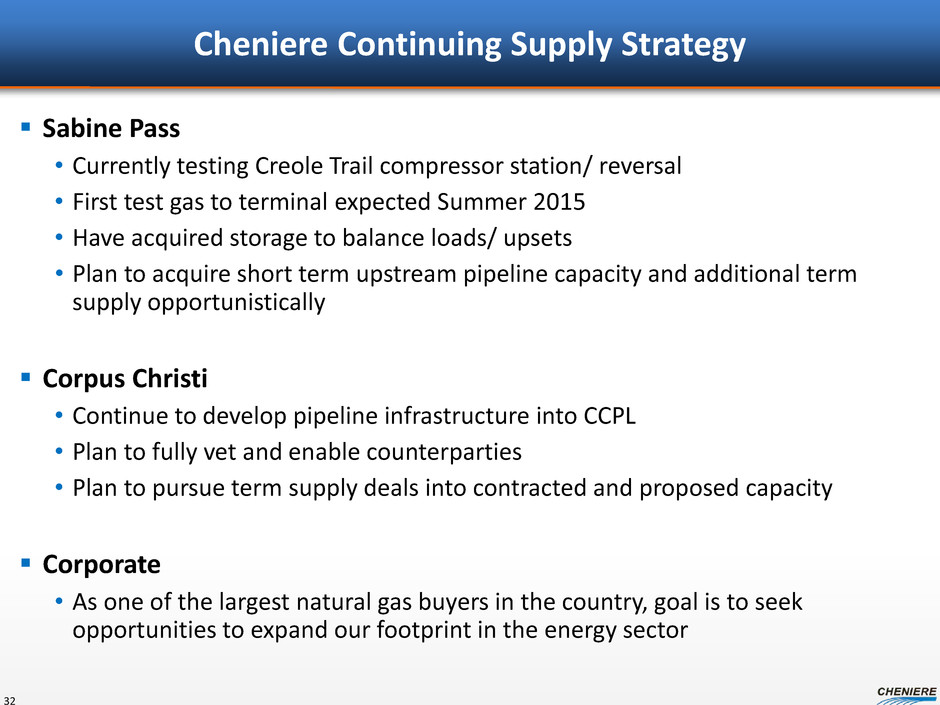 Corpus Christi Supply – Personnel 31 Sabine Pass Corpus Christi In Process In Process In Process Gas procurement • Cheniere to secure gas at the terminal for liquefaction How gas procurement is achieved • Establish counterparty / market liquidity • Capacity contracted at terminal level – Redundant delivery capacity • Capacity contracted upstream of terminal – Supply basin diversity – Supplier diversity • Term gas purchases into capacities – Reduces physical market exposure – Reduces pricing exposure to match SPA pricing • Personnel