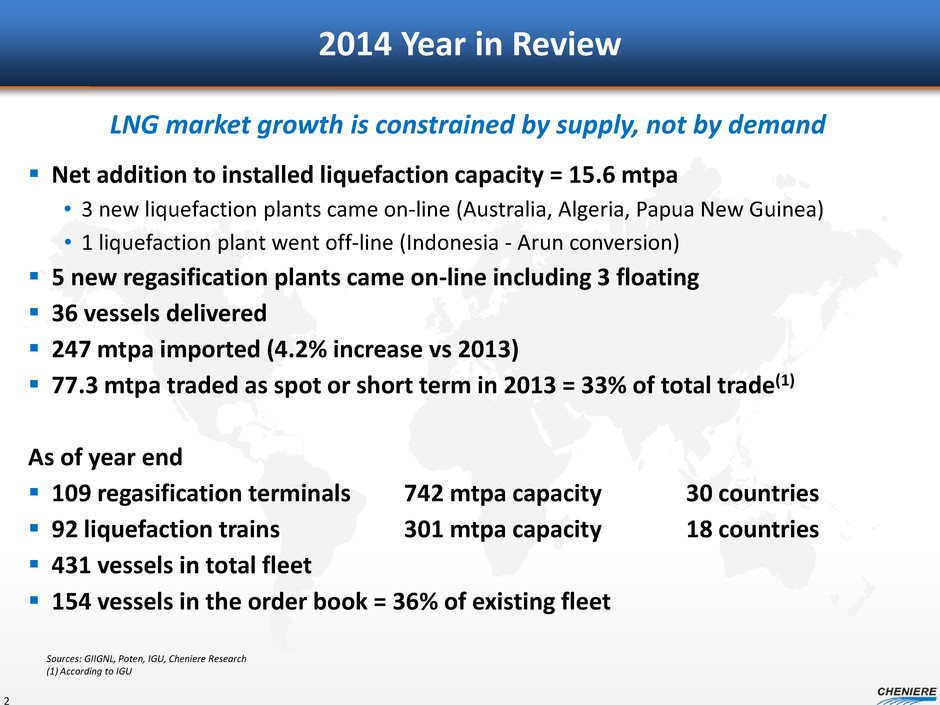 2014 Year in Review Net addition to installed liquefaction capacity = 15.6 mtpa • 3 new liquefaction plants came on-line (Australia, Algeria, Papua New Guinea) • 1 liquefaction plant went off-line (Indonesia - Arun conversion) 5 new regasification plants came on-line including 3 floating 36 vessels delivered 247 mtpa imported (4.2% increase vs 2013) 77.3 mtpa traded as spot or short term in 2013 = 33% of total trade(1) As of year end 109 regasification terminals 742 mtpa capacity 30 countries 92 liquefaction trains 301 mtpa capacity 18 countries 431 vessels in total fleet 154 vessels in the order book = 36% of existing fleet LNG market growth is constrained by supply, not by demand Sources: GIIGNL, Poten, IGU, Cheniere Research (1) According to IGU 2