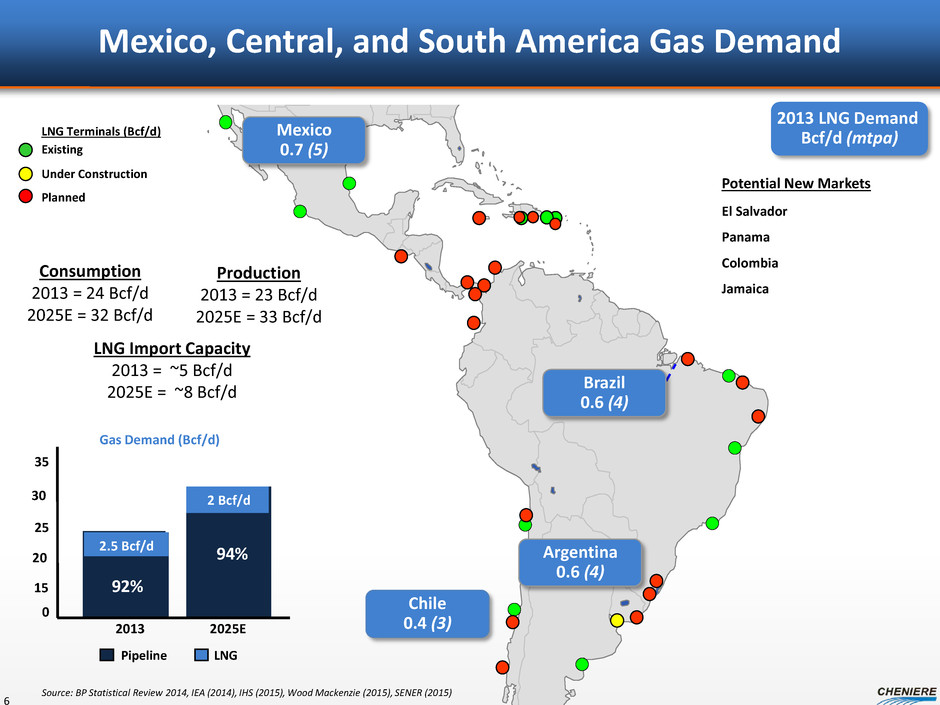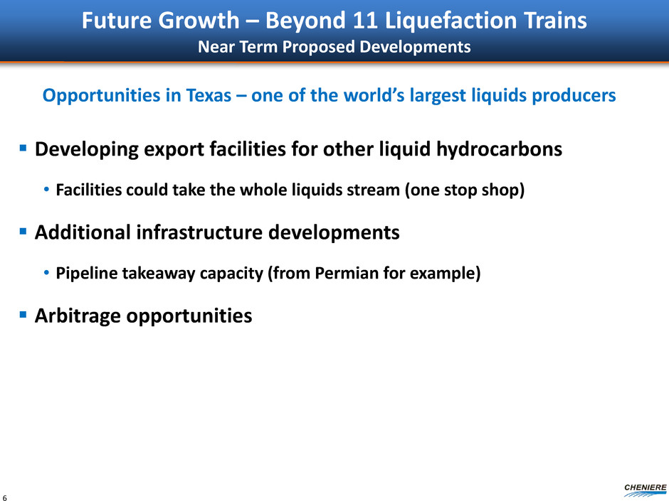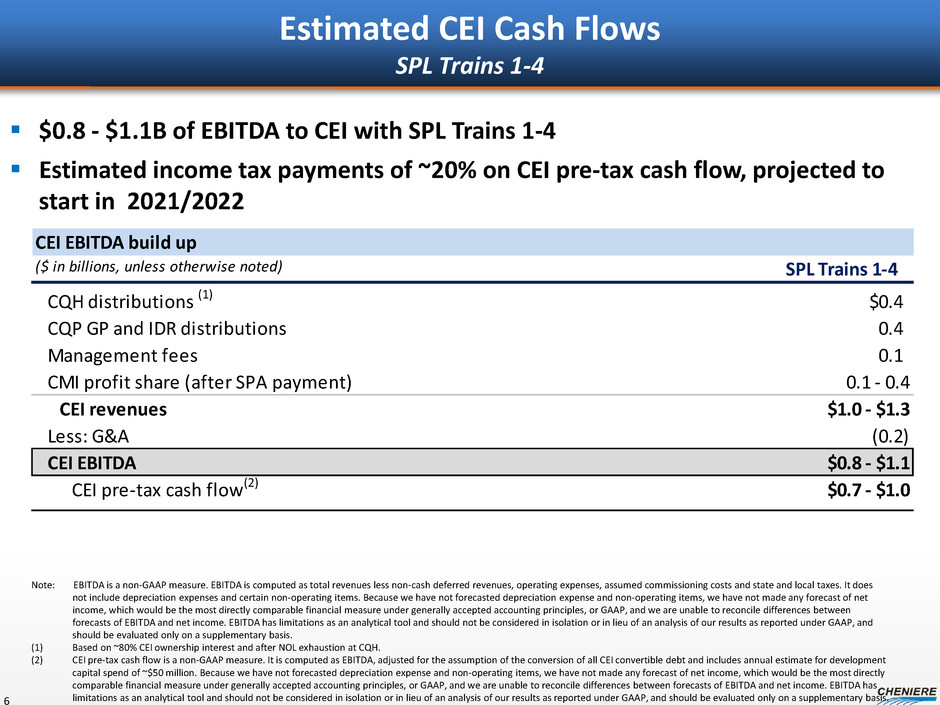 Estimated CEI EBITDA per Share 5 Projects evaluated with an emphasis on cash flows 9 Liquefaction Trains ~$15 11 Liquefaction Trains Initiating process to develop additional trains ~$20 Targeting Future Growth (2020) Other hydrocarbon exports Infrastructure development/acquisitions International projects Small-scale LNG projects ~$30(1) Note: See “Forward Looking Statements” Slide EBITDA per share is a non-GAAP measure. We have not made any forecast of net income, which would be the most comparable financial measure under GAAP, and we are unable to reconcile differences between forecasted EBITDA and net income. EBITDA has limitations as an analytical tool and should not be considered in isolation or in lieu of an analysis of our results as reported under GAAP, and should be evaluated only on a supplementary basis. Assumes ~278.6 million CEI shares outstanding. (1) Management goals based on assessment of current and potential future project development opportunities, which, among other things, would require acceptable commercial and financing arrangements, and may require regulatory approvals before we make final investment decisions. Actual performance may differ materially from the goals.