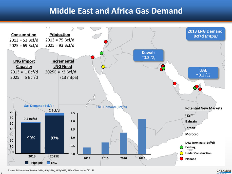 Mexico, Central, and South America Gas Demand Source: BP Statistical Review 2014, IEA (2014), IHS (2015), Wood Mackenzie (2015), SENER (2015) Gas Demand (Bcf/d) Pipeline 35 30 25 15 0 2013 2025E Pipeline LNG 94% 88% 2 Bcf/d LNG Import Capacity 2013 = ~5 Bcf/d 2025E = ~8 Bcf/d Consumption 2013 = 24 Bcf/d 2025E = 32 Bcf/d Brazil 0.6 (4) Argentina 0.6 (4) Chile 0.4 (3) Production 2013 = 23 Bcf/d 2025E = 33 Bcf/d LNG Terminals (Bcf/d) Existing Under Construction Planned Potential New Markets El Salvador Panama Colombia Jamaica Mexico 0.7 (5) 94% 92% 2 cf/d 2.5 Bcf/d 20 2013 LNG Demand Bcf/d (mtpa) 6