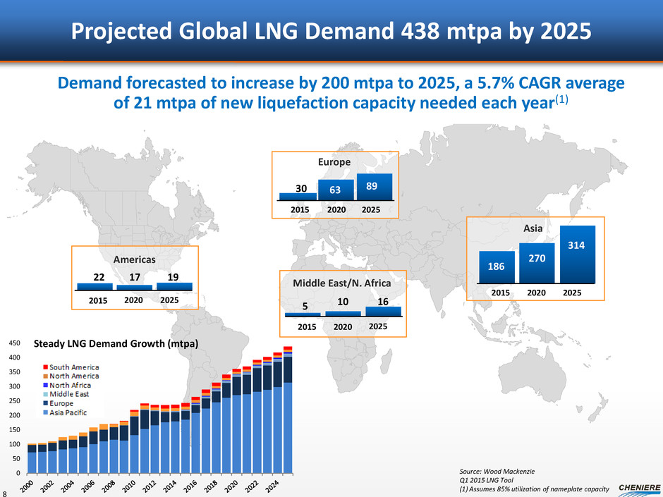 Middle East and Africa Gas Demand LNG Terminals (Bcf/d) Existing Under Construction Planned Gas Demand (Bcf/d) Pipeline 70 60 50 40 30 20 10 0 2013 2025E Pipeline LNG 97% 99% 2 Bcf/d 0.4 Bcf/d LNG Import Capacity 2013 = 1 Bcf/d 2025 = 5 Bcf/d Consumption 2013 = 53 Bcf/d 2025 = 69 Bcf/d Production 2013 = 75 Bcf/d 2025 = 93 Bcf/d Source: BP Statistical Review 2014, IEA (2014), IHS (2015), Wood Mackenzie (2015) Incremental LNG Need 2025E = ~2 Bcf/d (13 mtpa) Kuwait ~0.3 (2) 2013 LNG Demand Bcf/d (mtpa) UAE ~0.1 (1) Potential New Markets Egypt Bahrain Jordan Morocco 0.0 0.5 1.0 1.5 2.0 2.5 2013 2015 2020 2025 LNG Demand (Bcf/d) 7