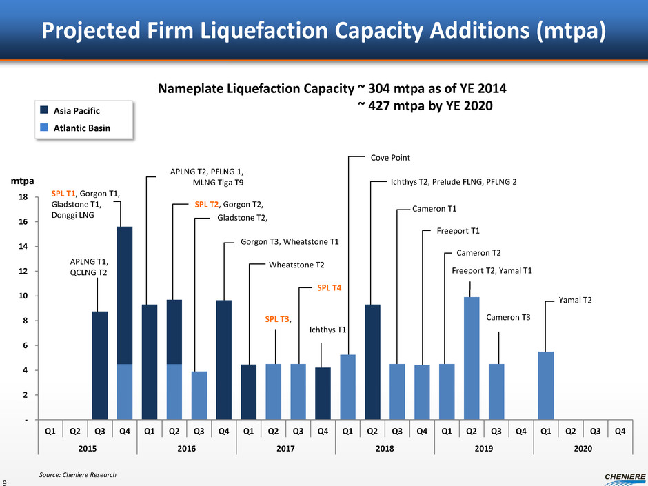 Projected Global LNG Demand 438 mtpa by 2025 8 22 17 19 2015 2020 2025 2015 2020 2025 5 10 16 2015 2020 2025 2015 2020 2025 Americas Asia Middle East/N. Africa 186 270 314 30 63 89 Europe Source: Wood Mackenzie Q1 2015 LNG Tool (1) Assumes 85% utilization of nameplate capacity Demand forecasted to increase by 200 mtpa to 2025, a 5.7% CAGR average of 21 mtpa of new liquefaction capacity needed each year(1) 0 50 100 150 200 250 300 350 400 450 Steady LNG Demand Growth (mtpa)
