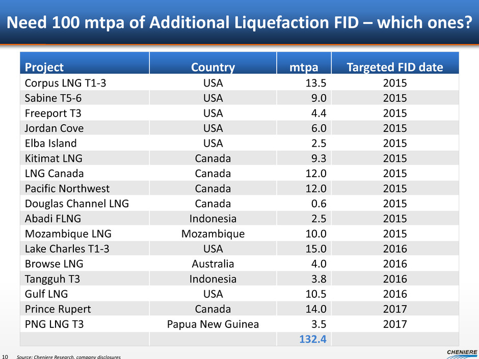 Projected Firm Liquefaction Capacity Additions (mtpa) 9 Source: Cheniere Research Nameplate Liquefaction Capacity ~ 304 mtpa as of YE 2014 ~ 427 mtpa by YE 2020 Asia Pacific Atlantic Basin SPL T1, Gorgon T1, Gladstone T1, Donggi LNG Gorgon T3, Wheatstone T1 APLNG T2, PFLNG 1, MLNG Tiga T9 Wheatstone T2 Gladstone T2, SPL T4 Freeport T1 Ichthys T2, Prelude FLNG, PFLNG 2 Yamal T2 SPL T2, Gorgon T2, Ichthys T1 mtpa APLNG T1, QCLNG T2 Cameron T1 Cameron T2 Cameron T3 Freeport T2, Yamal T1 Cove Point - 2 4 6 8 10 12 14 16 18 Q1 Q2 Q3 Q4 Q1 Q2 Q3 Q4 Q1 Q2 Q3 Q4 Q1 Q2 Q3 Q4 Q1 Q2 Q3 Q4 Q1 Q2 Q3 Q4 2015 2016 2017 2018 2019 2020