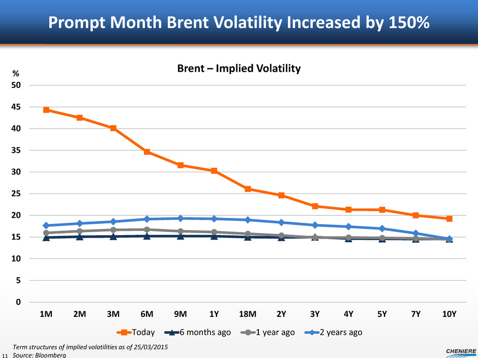 Swing Producer U.S. Reacts, Rest of the World Does Not 10 $0 $25 $50 $75 $100 $125 $150 0 500 1,000 1,500 2,000 1997 2000 2003 2006 2009 2012 2015 Rig Activity Vs. Brent Price Brent U.S. Rigs International Rigs 0 1 2 3 4 5 6 7 8 9 10 2009 2010 2011 2012 2013 2014 2015 US Crude Production Wedge Growing 2.1M bpd Sources: EIA, Baker Hughes, Cheniere Research Unconventional Declines Unprecedented ROW Rig Response Has Been Muted Ex-North America almost unfazed by bust • ROW just -33 rigs since October • Middle East, Africa added rigs Internationals mimic past cycles • No drastic change of pace in 1998, 2002 or 2008 • Saudi signaling no cuts to production U.S. supply expected to be quicker to react to changes in activity Estimates of Year 1 declines of around 2.1 MMbpd U.S. taking role of world’s swing producer Rigs Brent Legacy Production Million b/d Annual Supply Additions