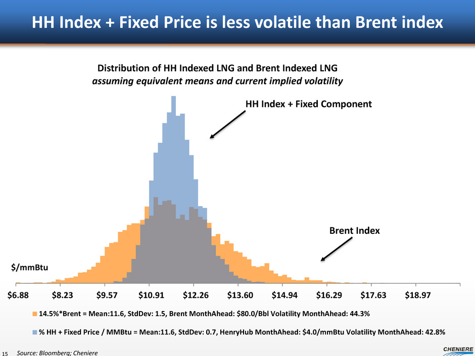 HH Index + Fixed Price is less volatile than Brent index 15 Source: Bloomberg; Cheniere $6.88 $8.23 $9.57 $10.91 $12.26 $13.60 $14.94 $16.29 $17.63 $18.97 $/mmBtu Distribution of HH Indexed LNG and Brent Indexed LNG assuming equivalent means and current implied volatility 14.5%*Brent = Mean:11.6, StdDev: 1.5, Brent MonthAhead: $80.0/Bbl Volatility MonthAhead: 44.3% % HH + Fixed Price / MMBtu = Mean:11.6, StdDev: 0.7, HenryHub MonthAhead: $4.0/mmBtu Volatility MonthAhead: 42.8% HH Index + Fixed Component Brent Index