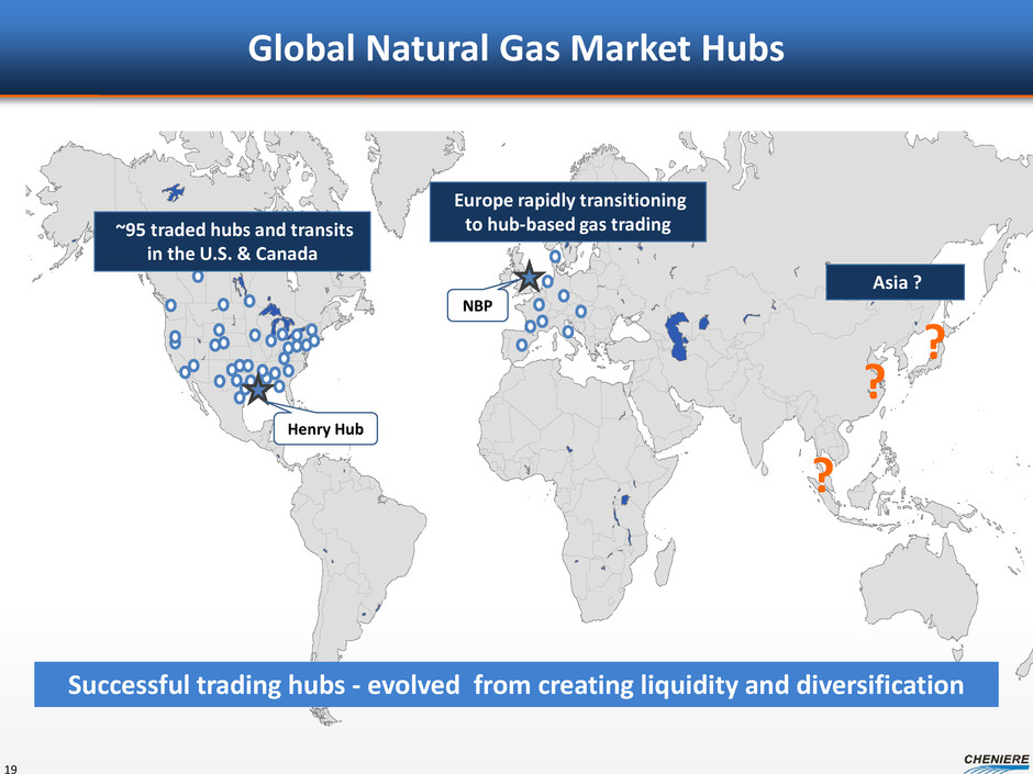 Global Natural Gas Market Hubs 19 ~95 traded hubs and transits in the U.S. & Canada NBP ? ? ? Europe rapidly transitioning to hub-based gas trading Asia ? Successful trading hubs - evolved from creating liquidity and diversification Henry Hub