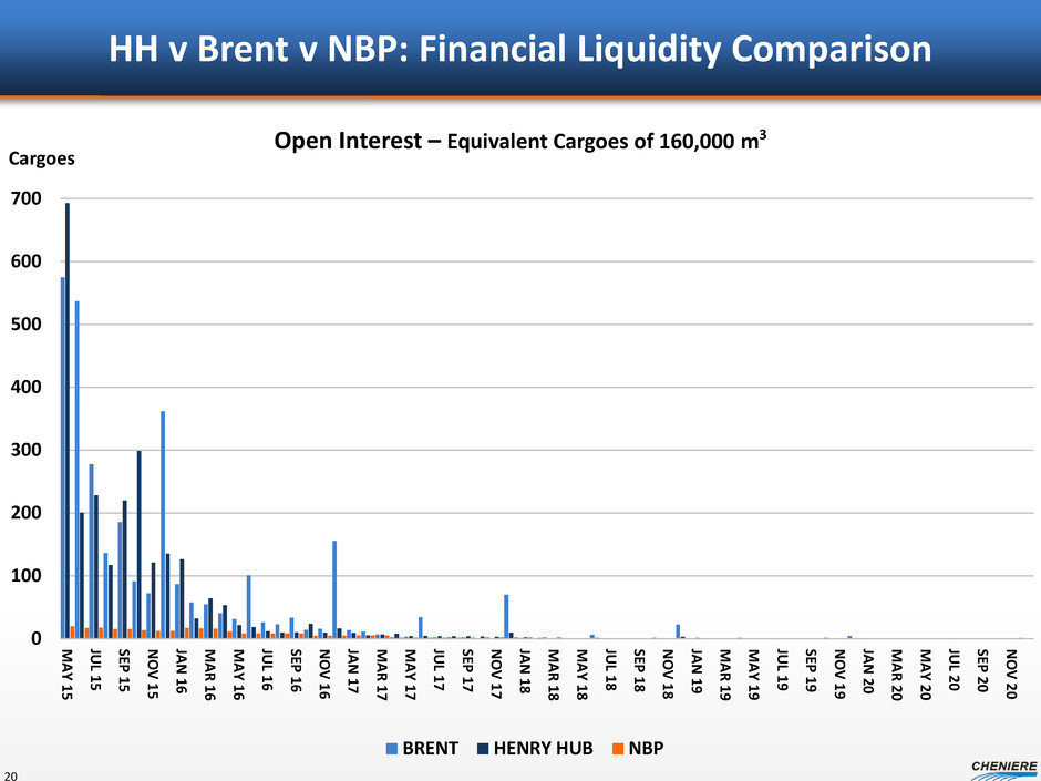 HH v Brent v NBP: Financial Liquidity Comparison 20 0 100 200 300 400 500 600 700 M A Y 15 JU L 15 SEP 15 N O V 15 JA N 16 M A R 16 M A Y 16 JU L 16 SEP 16 N O V 16 JA N 17 M A R 17 M A Y 17 JU L 17 SEP 17 N O V 17 JA N 18 M A R 18 M A Y 18 JU L 18 SEP 18 N O V 18 JA N 19 M A R 19 M A Y 19 JU L 19 SEP 19 N O V 19 JA N 20 M A R 20 M A Y 20 JU L 20 SEP 20 N O V 20 Cargoes Open Interest – Equivalent Cargoes of 160,000 m3 BRENT HENRY HUB NBP