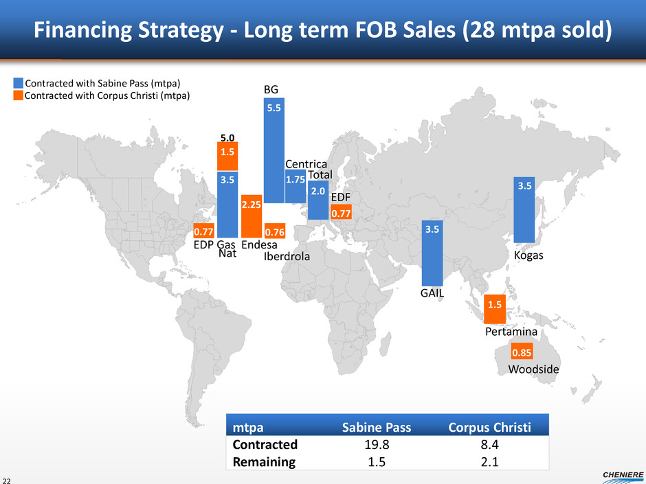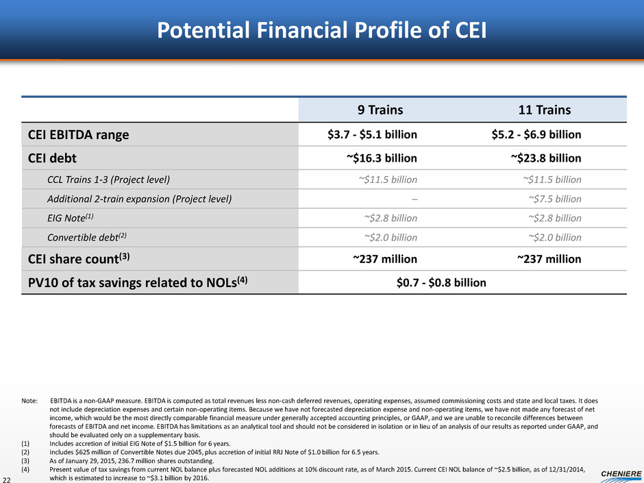 $1.7 $0.7 $0.6 $0.4 $0.4 $0.3 $0.1 $0.4 $0.5 $1.0 $3.2 $0.5 $2.0 $0.3 $1.7 $2.4 - $3.0 $0.8 - $1.0 $0.5 - $1.0 $1.5 - $1.8 $5.2 - $6.9 – $1.0 $2.0 $3.0 $4.0 $5.0 $6.0 $7.0 CE I E B IT D A ( $ in b ill io ns ) Estimated CEI EBITDA Build Up SPL Trains 1-6, CCL Trains 1-3, Additional 2-train expansion 21 Number of trains 7 trains 8 trains 9 trains 11 trains Nameplate capacity 31.5 MTPA 36.0 MTPA 40.5 MTPA 49.5 MTPA Long term SPA volumes 27.4 MTPA 30.25 MTPA 31.75 MTPA 38.75 MTPA CMI portfolio volumes 4.1 MTPA 5.75 MTPA 8.75 MTPA 10.75 MTPA Assumed CMI LNG gross margin $4.00 - $7.00/MMBtu Note: EBITDA is a non-GAAP measure. EBITDA is computed as total revenues less non-cash deferred revenues, operating expenses, assumed commissioning costs and state and local taxes. It does not include depreciation expenses and certain non-operating items. Because we have not forecasted depreciation expense and non-operating items, we have not made any forecast of net income, which would be the most directly comparable financial measure under generally accepted accounting principles, or GAAP, and we are unable to reconcile differences between forecasts of EBITDA and net income. EBITDA has limitations as an analytical tool and should not be considered in isolation or in lieu of an analysis of our results as reported under GAAP, and should be evaluated only on a supplementary basis. Cumulative build up CCL T3 (LT SPA) SPL T1-5, CCL T1-2 (LT SPA) SPL T6 (LT SPA) CMI Sales Additional 2-train expansion (LT SPA) Total