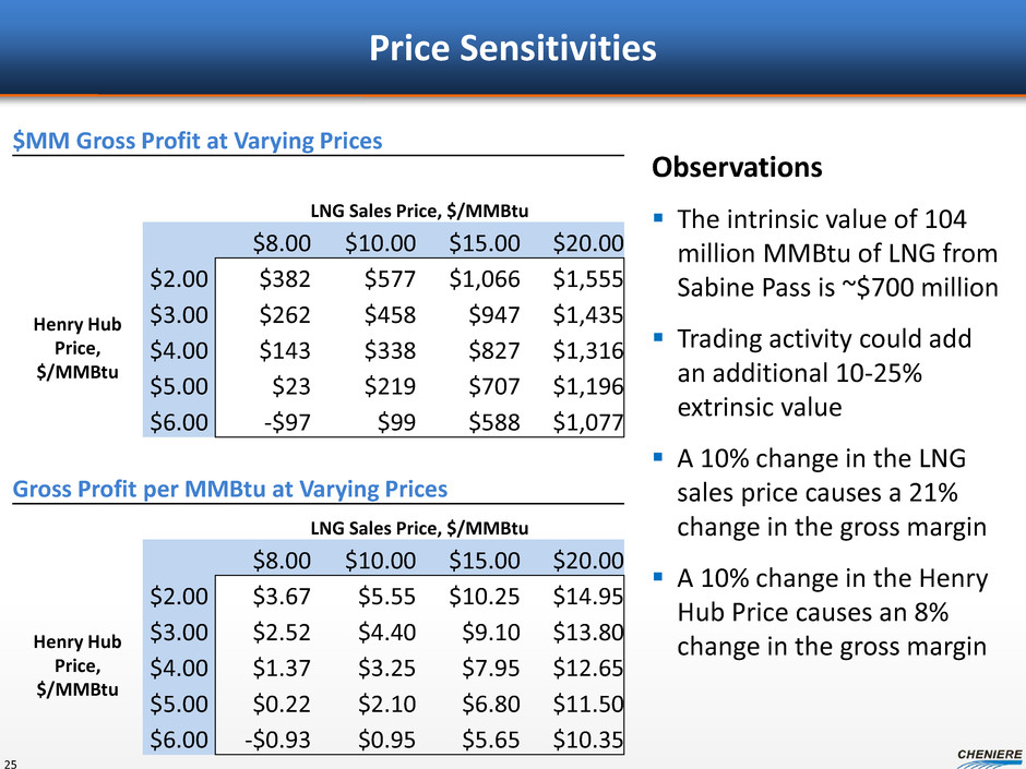 Annual Gross Profit from 2 mtpa 24 Assumptions $5 Henry Hub Price $15 LNG sales price, delivered at terminal 6% loss of gas on the vessel Cheniere vessels: $84,000 per day average charter rate Port / Canal costs: $900,000 per voyage 1 incremental vessel needed at $100,000 per day Financing costs: $250,000 per cargo for LCs at L+250 Volumes LNG Loaded Sabine Pass (Tbtu) 104 LNG Delivered DES (Tbtu) 98 Cash Flows Sales Total Revenue ($MM) 1,466$ Expenses LNG purchase from Sabine (598) Vessel Charter Costs (92) Port and Canal Costs (25) Incremental Vessel Charters (37) Financing Costs (7) Gross Profit ($MM) 707$ Gross Profit ($/MMBtu) 6.80$