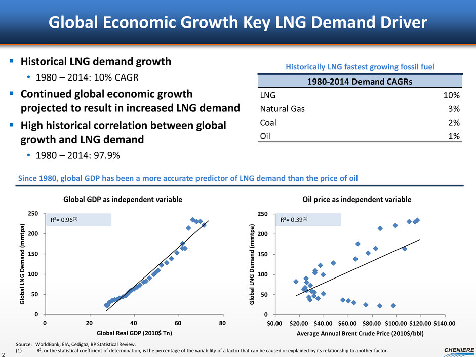 0 50 100 150 200 250 $0.00 $20.00 $40.00 $60.00 $80.00 $100.00 $120.00 $140.00 G lo ba l L N G D em an d (m m tp a) Average Annual Brent Crude Price (2010$/bbl) 0 50 100 150 200 250 0 20 40 60 80 G lo ba l L N G D em an d (m m tp a) Global Real GDP (2010$ Tn) 1980-2014 Demand CAGRs LNG 10% Natural Gas 3% Coal 2% Oil 1% Global Economic Growth Key LNG Demand Driver Historical LNG demand growth • 1980 – 2014: 10% CAGR Continued global economic growth projected to result in increased LNG demand High historical correlation between global growth and LNG demand • 1980 – 2014: 97.9% 2 Since 1980, global GDP has been a more accurate predictor of LNG demand than the price of oil Historically LNG fastest growing fossil fuel Global GDP as independent variable Oil price as independent variable Source: WorldBank, EIA, Cedigaz, BP Statistical Review. (1) R2, or the statistical coefficient of determination, is the percentage of the variability of a factor that can be caused or explained by its relationship to another factor. R2= 0.39(1) R2= 0.96(1)