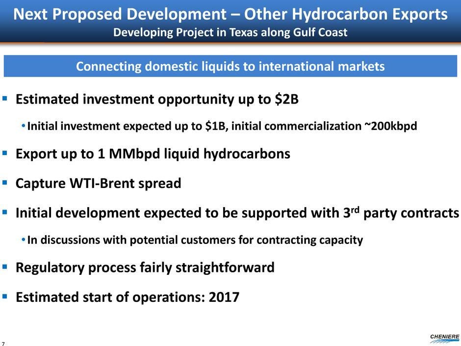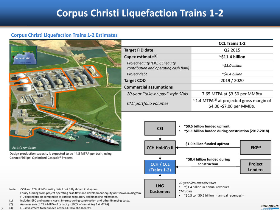 CEI EBITDA build up ($ in billions, unless otherwise noted) SPL Trains 1-4 CQH distributions (1) $0.4 CQP GP and IDR distributions 0.4 Management fees 0.1 CMI profit share (after SPA payment) 0.1 - 0.4 CEI revenues $1.0 - $1.3 Less: G&A (0.2) CEI EBITDA $0.8 - $1.1 CEI pre-tax cash flow(2) $0.7 - $1.0 Estimated CEI Cash Flows SPL Trains 1-4 6 Note: EBITDA is a non-GAAP measure. EBITDA is computed as total revenues less non-cash deferred revenues, operating expenses, assumed commissioning costs and state and local taxes. It does not include depreciation expenses and certain non-operating items. Because we have not forecasted depreciation expense and non-operating items, we have not made any forecast of net income, which would be the most directly comparable financial measure under generally accepted accounting principles, or GAAP, and we are unable to reconcile differences between forecasts of EBITDA and net income. EBITDA has limitations as an analytical tool and should not be considered in isolation or in lieu of an analysis of our results as reported under GAAP, and should be evaluated only on a supplementary basis. (1) Based on ~80% CEI ownership interest and after NOL exhaustion at CQH. (2) CEI pre-tax cash flow is a non-GAAP measure. It is computed as EBITDA, adjusted for the assumption of the conversion of all CEI convertible debt and includes annual estimate for development capital spend of ~$50 million. Because we have not forecasted depreciation expense and non-operating items, we have not made any forecast of net income, which would be the most directly comparable financial measure under generally accepted accounting principles, or GAAP, and we are unable to reconcile differences between forecasts of EBITDA and net income. EBITDA has limitations as an analytical tool and should not be considered in isolation or in lieu of an analysis of our results as reported under GAAP, and should be evaluated only on a supplementary basis. $0.8 - $1.1B of EBITDA to CEI with SPL Trains 1-4 Estimated income tax payments of ~20% on CEI pre-tax cash flow, projected to start in 2021/2022
