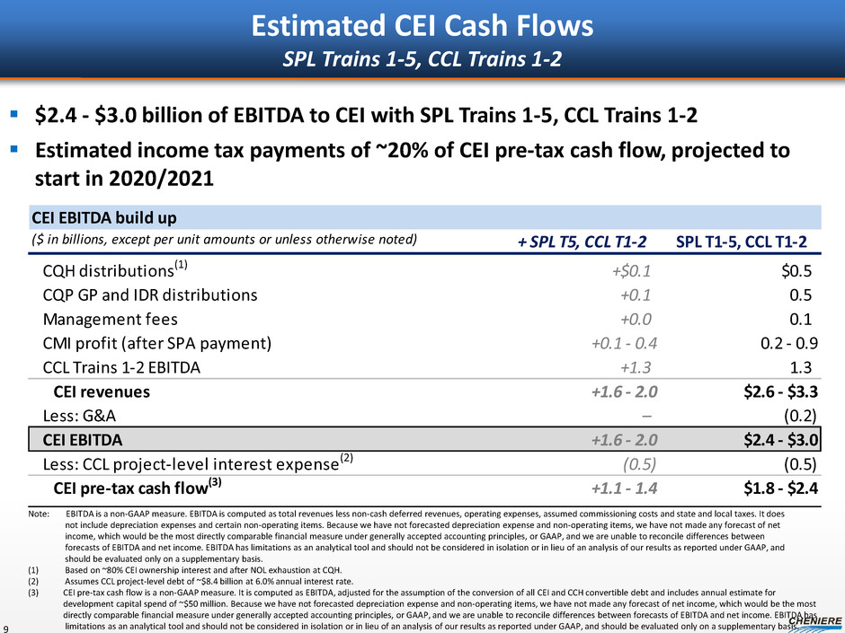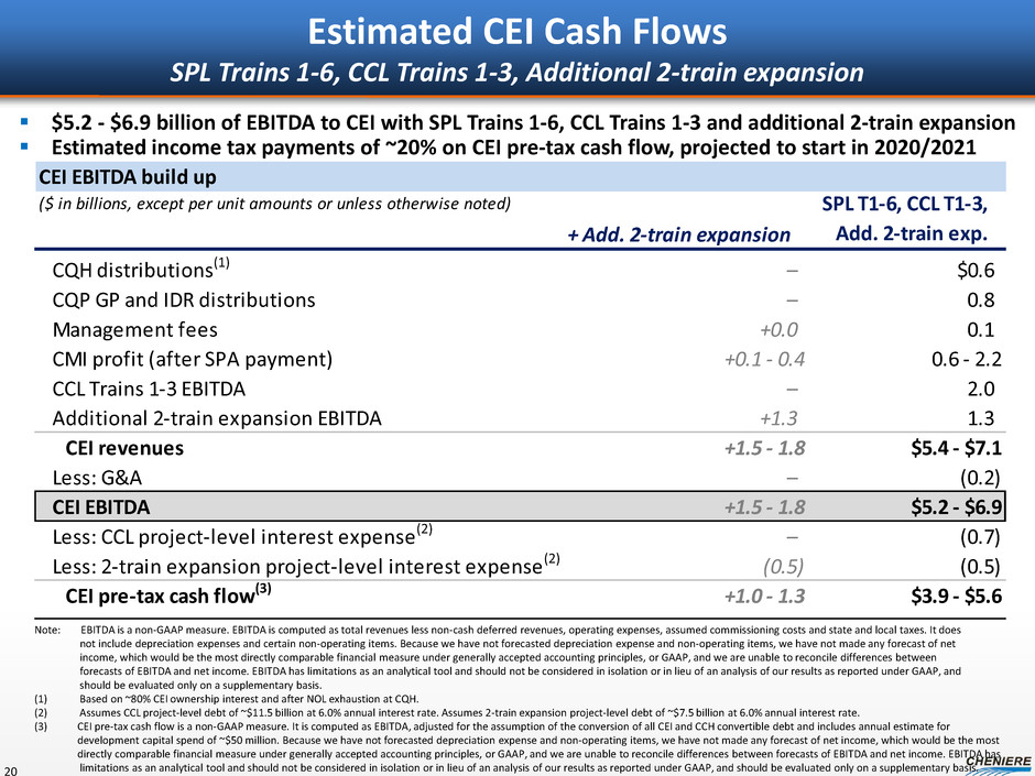 CEI EBITDA build up ($ in billions, except per unit amounts or unless otherwise noted) + Add. 2-train expansion SPL T1-6, CCL T1-3, Add. 2-train exp. CQH distributions(1) – $0.6 CQP GP and IDR distributions – 0.8 Management fees +0.0 0.1 CMI profit (after SPA payment) +0.1 - 0.4 0.6 - 2.2 CCL Trains 1-3 EBITDA – 2.0 Additional 2-train expansion EBITDA +1.3 1.3 CEI revenues +1.5 - 1.8 $5.4 - $7.1 Less: G&A – (0.2) CEI EBITDA +1.5 - 1.8 $5.2 - $6.9 Less: CCL project-level interest expense(2) – (0.7) Less: 2-train expansion project-level interest expense(2) (0.5) (0.5) CEI pre-tax cash flow(3) +1.0 - 1.3 $3.9 - $5.6 Estimated CEI Cash Flows SPL Trains 1-6, CCL Trains 1-3, Additional 2-train expansion 20 $5.2 - $6.9 billion of EBITDA to CEI with SPL Trains 1-6, CCL Trains 1-3 and additional 2-train expansion Estimated income tax payments of ~20% on CEI pre-tax cash flow, projected to start in 2020/2021 Note: EBITDA is a non-GAAP measure. EBITDA is computed as total revenues less non-cash deferred revenues, operating expenses, assumed commissioning costs and state and local taxes. It does not include depreciation expenses and certain non-operating items. Because we have not forecasted depreciation expense and non-operating items, we have not made any forecast of net income, which would be the most directly comparable financial measure under generally accepted accounting principles, or GAAP, and we are unable to reconcile differences between forecasts of EBITDA and net income. EBITDA has limitations as an analytical tool and should not be considered in isolation or in lieu of an analysis of our results as reported under GAAP, and should be evaluated only on a supplementary basis. (1) Based on ~80% CEI ownership interest and after NOL exhaustion at CQH. (2) Assumes CCL project-level debt of ~$11.5 billion at 6.0% annual interest rate. Assumes 2-train expansion project-level debt of ~$7.5 billion at 6.0% annual interest rate. (3) CEI pre-tax cash flow is a non-GAAP measure. It is computed as EBITDA, adjusted for the assumption of the conversion of all CEI and CCH convertible debt and includes annual estimate for development capital spend of ~$50 million. Because we have not forecasted depreciation expense and non-operating items, we have not made any forecast of net income, which would be the most directly comparable financial measure under generally accepted accounting principles, or GAAP, and we are unable to reconcile differences between forecasts of EBITDA and net income. EBITDA has limitations as an analytical tool and should not be considered in isolation or in lieu of an analysis of our results as reported under GAAP, and should be evaluated only on a supplementary basis.
