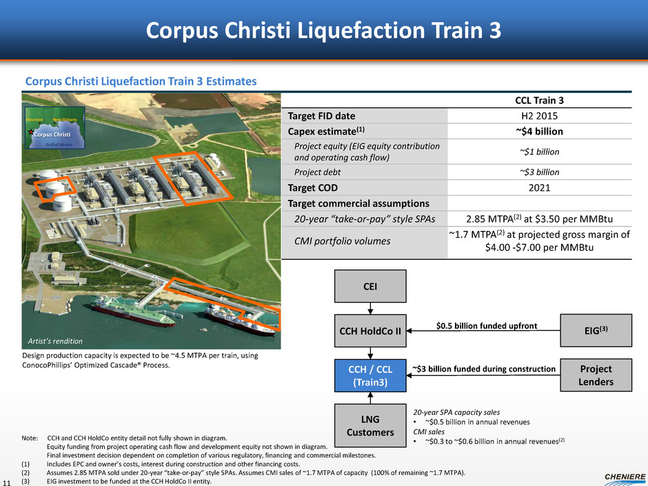 $1.7 $0.7 $0.6 $1.7 $0.7 $0.6 $2.4 - $3.0 $2.4 - $3.0 – $1.0 $2.0 $3.0 $4.0 $5.0 $6.0 $7.0 CE I E B IT D A ( $ in b ill io ns ) Estimated CEI EBITDA Build Up SPL Trains 1-5 and CCL Trains 1-2 10 Number of trains 7 trains Nameplate capacity 31.5 MTPA Long term SPA volumes 27.4 MTPA CMI portfolio volumes 4.1 MTPA Assumed CMI LNG gross margin $4.00 - $7.00/MMBtu Note: EBITDA is a non-GAAP measure. EBITDA is computed as total revenues less non-cash deferred revenues, operating expenses, assumed commissioning costs and state and local taxes. It does not include depreciation expenses and certain non-operating items. Because we have not forecasted depreciation expense and non-operating items, we have not made any forecast of net income, which would be the most directly comparable financial measure under generally accepted accounting principles, or GAAP, and we are unable to reconcile differences between forecasts of EBITDA and net income. EBITDA has limitations as an analytical tool and should not be considered in isolation or in lieu of an analysis of our results as reported under GAAP, and should be evaluated only on a supplementary basis. Cumulative build up SPL T1-5, CCL T1-2 (LT SPA) CMI Sales Total