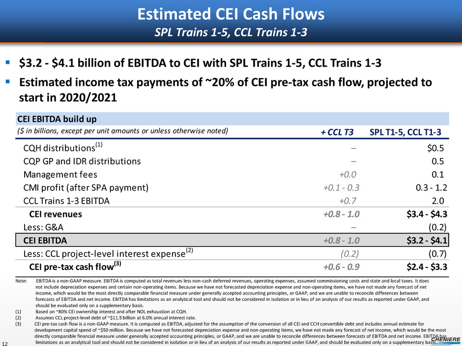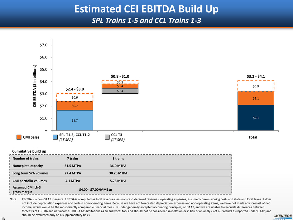 CEI EBITDA build up ($ in billions, except per unit amounts or unless otherwise noted) + CCL T3 SPL T1-5, CCL T1-3 CQH distributions(1) – $0.5 CQP GP and IDR distributions – 0.5 Management fees +0.0 0.1 CMI profit (after SPA payment) +0.1 - 0.3 0.3 - 1.2 CCL Trains 1-3 EBITDA +0.7 2.0 CEI revenues +0.8 - 1.0 $3.4 - $4.3 Less: G&A – (0.2) CEI EBITDA +0.8 - 1.0 $3.2 - $4.1 Less: CCL project-level interest expense(2) (0.2) (0.7) CEI pre-tax cash flow(3) +0.6 - 0.9 $2.4 - $3.3 Estimated CEI Cash Flows SPL Trains 1-5, CCL Trains 1-3 12 $3.2 - $4.1 billion of EBITDA to CEI with SPL Trains 1-5, CCL Trains 1-3 Estimated income tax payments of ~20% of CEI pre-tax cash flow, projected to start in 2020/2021 Note: EBITDA is a non-GAAP measure. EBITDA is computed as total revenues less non-cash deferred revenues, operating expenses, assumed commissioning costs and state and local taxes. It does not include depreciation expenses and certain non-operating items. Because we have not forecasted depreciation expense and non-operating items, we have not made any forecast of net income, which would be the most directly comparable financial measure under generally accepted accounting principles, or GAAP, and we are unable to reconcile differences between forecasts of EBITDA and net income. EBITDA has limitations as an analytical tool and should not be considered in isolation or in lieu of an analysis of our results as reported under GAAP, and should be evaluated only on a supplementary basis. (1) Based on ~80% CEI ownership interest and after NOL exhaustion at CQH. (2) Assumes CCL project-level debt of ~$11.5 billion at 6.0% annual interest rate. (3) CEI pre-tax cash flow is a non-GAAP measure. It is computed as EBITDA, adjusted for the assumption of the conversion of all CEI and CCH convertible debt and includes annual estimate for development capital spend of ~$50 million. Because we have not forecasted depreciation expense and non-operating items, we have not made any forecast of net income, which would be the most directly comparable financial measure under generally accepted accounting principles, or GAAP, and we are unable to reconcile differences between forecasts of EBITDA and net income. EBITDA has limitations as an analytical tool and should not be considered in isolation or in lieu of an analysis of our results as reported under GAAP, and should be evaluated only on a supplementary basis.