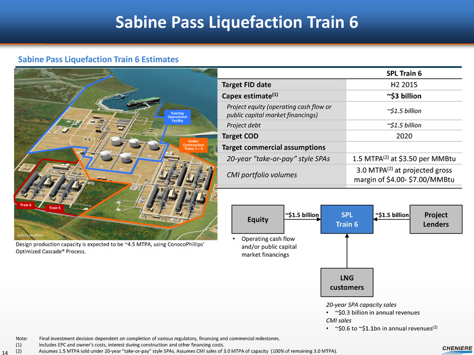$1.7 $0.7 $0.6 $0.4 $0.4 $0.3 $2.1 $1.1 $0.9 $2.4 - $3.0 $0.8 - $1.0 $3.2 - $4.1 – $1.0 $2.0 $3.0 $4.0 $5.0 $6.0 $7.0 CE I E B IT D A ( $ in b ill io ns ) Estimated CEI EBITDA Build Up SPL Trains 1-5 and CCL Trains 1-3 13 Number of trains 7 trains 8 trains Nameplate capacity 31.5 MTPA 36.0 MTPA Long term SPA volumes 27.4 MTPA 30.25 MTPA CMI portfolio volumes 4.1 MTPA 5.75 MTPA Assumed CMI LNG gross margin $4.00 - $7.00/MMBtu Note: EBITDA is a non-GAAP measure. EBITDA is computed as total revenues less non-cash deferred revenues, operating expenses, assumed commissioning costs and state and local taxes. It does not include depreciation expenses and certain non-operating items. Because we have not forecasted depreciation expense and non-operating items, we have not made any forecast of net income, which would be the most directly comparable financial measure under generally accepted accounting principles, or GAAP, and we are unable to reconcile differences between forecasts of EBITDA and net income. EBITDA has limitations as an analytical tool and should not be considered in isolation or in lieu of an analysis of our results as reported under GAAP, and should be evaluated only on a supplementary basis. Cumulative build up CCL T3 (LT SPA) SPL T1-5, CCL T1-2 (LT SPA) CMI Sales Total