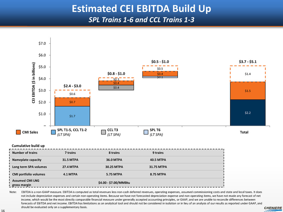CEI EBITDA build up ($ in billions, except per unit amounts or unless otherwise noted) + SPL T6 SPL T1-6, CCL T1-3 CQH distributions(1) +$0.1 $0.6 CQP GP and IDR distributions +0.3 0.8 Management fees +0.0 0.1 CMI profit (after SPA payment) +0.2 - 0.6 0.5 - 1.8 CCL Trains 1-3 EBITDA – 2.0 CEI revenues +0.6 - 1.0 $4.0 - $5.3 Less: G&A – (0.2) CEI EBITDA +0.6 - 1.0 $3.7 - $5.1 Less: CCL project-level interest expense(2) – (0.7) CEI pre-tax cash flow(3) +0.6 - 1.0 $2.9 - $4.3 Estimated CEI Cash Flows SPL Trains 1-6, CCL Trains 1-3 15 $3.7 - $5.1 billion of EBITDA to CEI with SPL Trains 1-6, CCL Trains 1-3 Estimated income tax payments of ~20% of CEI pre-tax cash flow, projected to start in 2020/2021 Note: EBITDA is a non-GAAP measure. EBITDA is computed as total revenues less non-cash deferred revenues, operating expenses, assumed commissioning costs and state and local taxes. It does not include depreciation expenses and certain non-operating items. Because we have not forecasted depreciation expense and non-operating items, we have not made any forecast of net income, which would be the most directly comparable financial measure under generally accepted accounting principles, or GAAP, and we are unable to reconcile differences between forecasts of EBITDA and net income. EBITDA has limitations as an analytical tool and should not be considered in isolation or in lieu of an analysis of our results as reported under GAAP, and should be evaluated only on a supplementary basis. (1) Based on ~80% CEI ownership interest and after NOL exhaustion at CQH. (2) Assumes CCL project-level debt of ~$11.5 billion at 6.0% annual interest rate. (3) CEI pre-tax cash flow is a non-GAAP measure. It is computed as EBITDA, adjusted for the assumption of the conversion of all CEI and CCH convertible debt and includes annual estimate for development capital spend of ~$50 million. Because we have not forecasted depreciation expense and non-operating items, we have not made any forecast of net income, which would be the most directly comparable financial measure under generally accepted accounting principles, or GAAP, and we are unable to reconcile differences between forecasts of EBITDA and net income. EBITDA has limitations as an analytical tool and should not be considered in isolation or in lieu of an analysis of our results as reported under GAAP, and should be evaluated only on a supplementary basis.