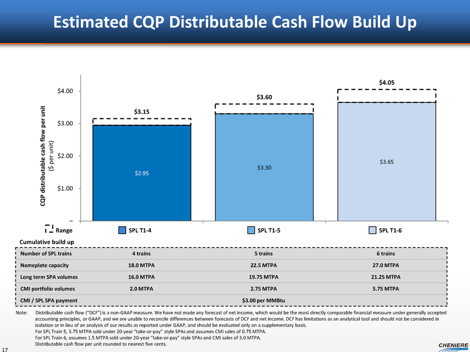 $1.7 $0.7 $0.6 $0.4 $0.4 $0.3 $0.1 $0.4 $0.5 $2.2 $1.5 $1.4 $2.4 - $3.0 $0.8 - $1.0 $0.5 - $1.0 $3.7 - $5.1 – $1.0 $2.0 $3.0 $4.0 $5.0 $6.0 $7.0 CE I E B IT D A ( $ in b ill io ns ) Estimated CEI EBITDA Build Up SPL Trains 1-6 and CCL Trains 1-3 16 Number of trains 7 trains 8 trains 9 trains Nameplate capacity 31.5 MTPA 36.0 MTPA 40.5 MTPA Long term SPA volumes 27.4 MTPA 30.25 MTPA 31.75 MTPA CMI portfolio volumes 4.1 MTPA 5.75 MTPA 8.75 MTPA Assumed CMI LNG gross margin $4.00 - $7.00/MMBtu Note: EBITDA is a non-GAAP measure. EBITDA is computed as total revenues less non-cash deferred revenues, operating expenses, assumed commissioning costs and state and local taxes. It does not include depreciation expenses and certain non-operating items. Because we have not forecasted depreciation expense and non-operating items, we have not made any forecast of net income, which would be the most directly comparable financial measure under generally accepted accounting principles, or GAAP, and we are unable to reconcile differences between forecasts of EBITDA and net income. EBITDA has limitations as an analytical tool and should not be considered in isolation or in lieu of an analysis of our results as reported under GAAP, and should be evaluated only on a supplementary basis. Cumulative build up CCL T3 (LT SPA) SPL T1-5, CCL T1-2 (LT SPA) SPL T6 (LT SPA) CMI Sales Total