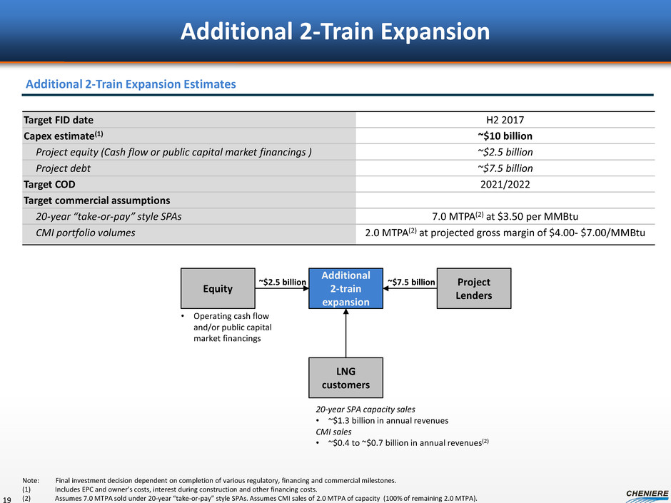 $2.35 $2.65 $2.90 $2.50 $2.90 $3.25 – $1.00 $2.00 $3.00 $4.00 CQ H d is tr ib ut ab le c as h fl ow p er s ha re ($ p er s ha re ) Estimated CQH Distributable Cash Flow Build Up 18 SPL T1-4 SPL T1-5 SPL T1-6 Note: Distributable cash flow (“DCF”) is a non-GAAP measure. We have not made any forecast of net income, which would be the most directly comparable financial measure under generally accepted accounting principles, or GAAP, and we are unable to reconcile differences between forecasts of DCF and net income. DCF has limitations as an analytical tool and should not be considered in isolation or in lieu of an analysis of our results as reported under GAAP, and should be evaluated only on a supplementary basis. For SPL Train 5, 3.75 MTPA sold under 20-year “take-or-pay” style SPAs and assumes CMI sales of 0.75 MTPA. For SPL Train 6, assumes 1.5 MTPA sold under 20-year “take-or-pay” style SPAs and CMI sales of 3.0 MTPA. Distributable cash flow per share rounded to nearest five cents. (1) Current CQH NOL balance of ~$0.4 billion, as of 12/31/2014, which is estimated to increase to ~$0.7 billion by 2016. Range Estimates assuming CQH NOL exhausted in 2020(1) with estimated income tax payments of 20% of pre-tax cash flow, thereafter Number of SPL trains 4 trains 5 trains 6 trains Nameplate capacity 18.0 MTPA 22.5 MTPA 27.0 MTPA Long term SPA volumes 16.0 MTPA 19.75 MTPA 21.25 MTPA CMI portfolio volumes 2.0 MTPA 2.75 MTPA 5.75 MTPA CMI / SPL SPA payment $3.00 per MMBtu Cumulative build up