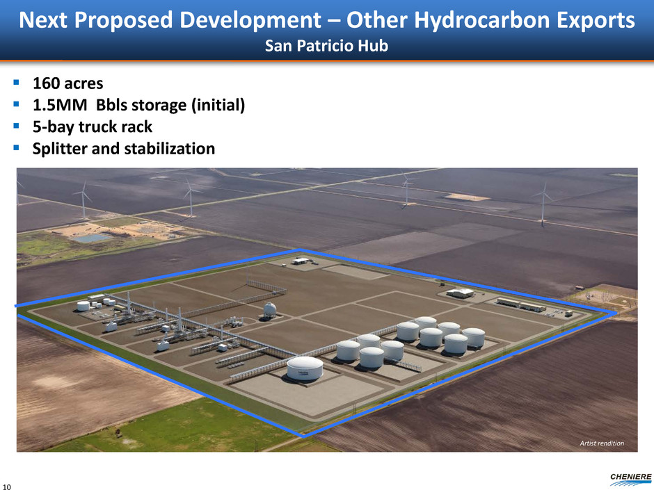 9 Next Proposed Development – Other Hydrocarbon Exports Cheniere Liquids Terminal at Ingleside, TX 550 acres Up to 1 MMBpd throughput 3 MM Bbls storage (initial) 5-bay truck rack Up to 2 marine docks – barge and ship, Aframax capable Artist rendition