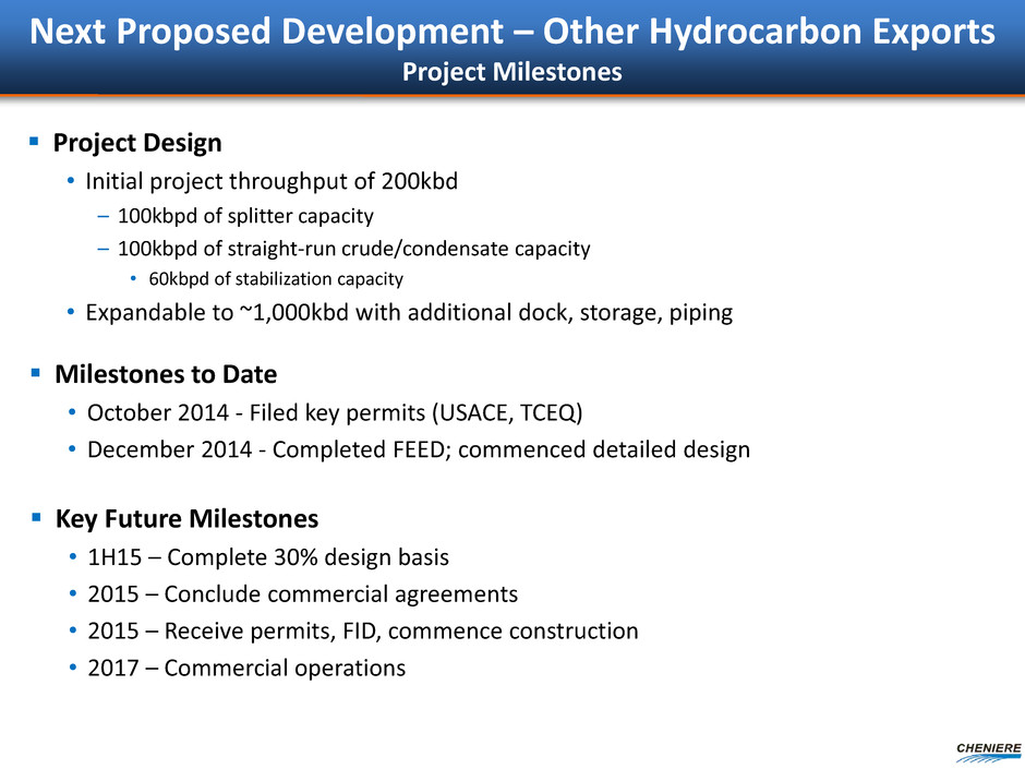Next Proposed Development – Other Hydrocarbon Exports Project Milestones Project Design • Initial project throughput of 200kbd – 100kbpd of splitter capacity – 100kbpd of straight-run crude/condensate capacity • 60kbpd of stabilization capacity • Expandable to ~1,000kbd with additional dock, storage, piping Milestones to Date • October 2014 - Filed key permits (USACE, TCEQ) • December 2014 - Completed FEED; commenced detailed design Key Future Milestones • 1H15 – Complete 30% design basis • 2015 – Conclude commercial agreements • 2015 – Receive permits, FID, commence construction • 2017 – Commercial operations