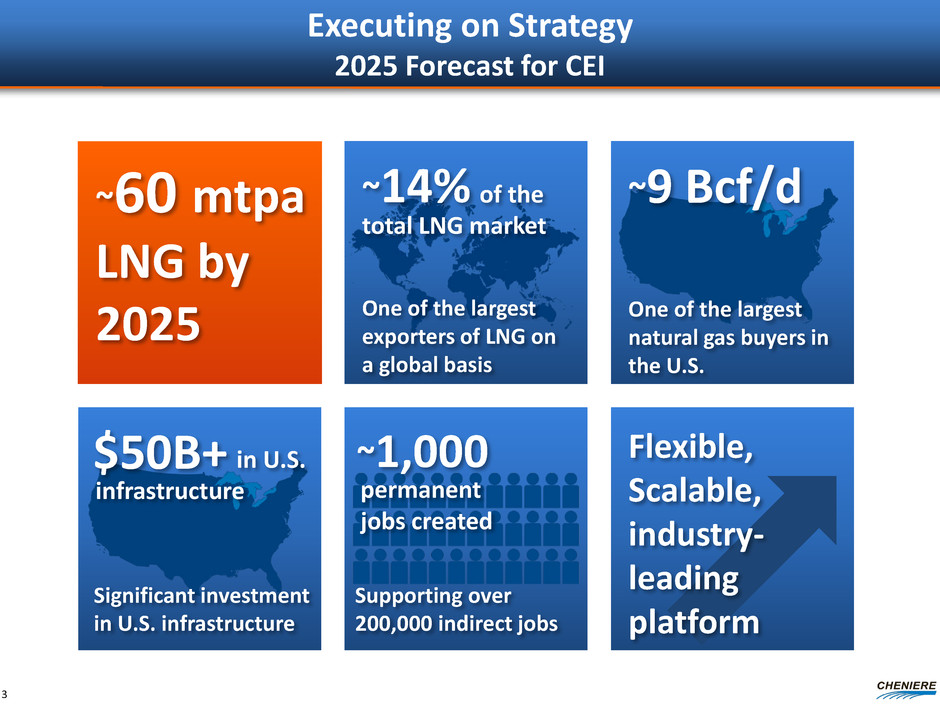 Forward Looking Statements This presentation contains certain statements that are, or may be deemed to be, “forward-looking statements” within the meaning of Section 27A of the Securities Act of 1933, as amended, and Section 21E of the Securities Exchange Act of 1934, as amended. All statements, other than statements of historical facts, included or incorporated by reference herein are “forward-looking statements.” Included among “forward-looking statements” are, among other things: statements regarding the ability of Cheniere Energy Partners, L.P. to pay distributions to its unitholders or Cheniere Energy Partners LP Holdings, LLC to pay dividends to its shareholders; statements regarding Cheniere Energy Inc.’s, Cheniere Energy Partners LP Holdings, LLC’s or Cheniere Energy Partners, L.P.’s expected receipt of cash distributions from their respective subsidiaries; statements that Cheniere Energy Partners, L.P. expects to commence or complete construction of its proposed liquefied natural gas (“LNG”) terminals, liquefaction facilities, pipeline facilities or other projects, or any expansions thereof, by certain dates or at all; statements that Cheniere Energy, Inc. expects to commence or complete construction of its proposed LNG terminals, liquefaction facilities, pipeline facilities or other projects by certain dates or at all; statements regarding future levels of domestic and international natural gas production, supply or consumption or future levels of LNG imports into or exports from North America and other countries worldwide, or purchases of natural gas, regardless of the source of such information, or the transportation or other infrastructure, or demand for and prices related to natural gas, LNG or other hydrocarbon products; statements regarding any financing transactions or arrangements, or ability to enter into such transactions; statements relating to the construction of our proposed liquefaction facilities and natural gas liquefaction trains (“Trains”), or modifications to the Creole Trail Pipeline, including statements concerning the engagement of any engineering, procurement and construction ("EPC") contractor or other contractor and the anticipated terms and provisions of any agreement with any EPC or other contractor, and anticipated costs related thereto; statements regarding any agreement to be entered into or performed substantially in the future, including any revenues anticipated to be received and the anticipated timing thereof, and statements regarding the amounts of total LNG regasification, liquefaction or storage capacities that are, or may become, subject to contracts; statements regarding counterparties to our commercial contracts, construction contracts and other contracts; statements regarding our planned development and construction of additional Trains, including the financing of such Trains; statements that our Trains, when completed, will have certain characteristics, including amounts of liquefaction capacities; statements regarding our business strategy, our strengths, our business and operation plans or any other plans, forecasts, projections or objectives, including anticipated revenues and capital expenditures and EBITDA, any or all of which are subject to change; statements regarding projections of revenues, expenses, earnings or losses, working capital or other financial items; statements regarding legislative, governmental, regulatory, administrative or other public body actions, approvals, requirements, permits, applications, filings, investigations, proceedings or decisions; statements regarding our anticipated LNG and natural gas marketing activities; and any other statements that relate to non-historical or future information. These forward-looking statements are often identified by the use of terms and phrases such as “achieve,” “anticipate,” “believe,” “contemplate,” “develop,” “estimate,” “example,” “expect,” “forecast,” “goals,” “opportunities,” “plan,” “potential,” “project,” “propose,” “subject to,” “strategy,” “target,” and similar terms and phrases, or by use of future tense. Although we believe that the expectations reflected in these forward-looking statements are reasonable, they do involve assumptions, risks and uncertainties, and these expectations may prove to be incorrect. You should not place undue reliance on these forward-looking statements, which speak only as of the date of this presentation. Our actual results could differ materially from those anticipated in these forward-looking statements as a result of a variety of factors, including those discussed in “Risk Factors” in the Cheniere Energy, Inc., Cheniere Energy Partners, L.P. and Cheniere Energy Partners LP Holdings, LLC Annual Reports on Form 10-K filed with the SEC on February 20, 2015, which are incorporated by reference into this presentation. All forward-looking statements attributable to us or persons acting on our behalf are expressly qualified in their entirety by these ”Risk Factors.” These forward-looking statements are made as of the date of this presentation, and other than as required under the securities laws, we undertake no obligation to publicly update or revise any forward-looking statements. 2