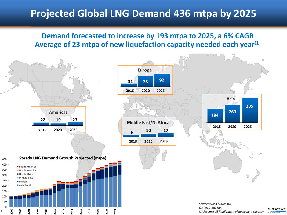 Cheniere’s Key Businesses Four planned LNG terminals to be located along Gulf of Mexico ~60 mtpa planned Scalable platform SPL T1-5 and CCL 1- 2 underpinned by long-term contracts, competitive capital costs LNG sales, FOB or DES, provided to customers on a short, mid, and long-term basis ~9 mtpa LNG volumes expected from SPL T1-6 and CCL T1-3 3 chartered LNG vessels to date Developing/ investing in infrastructure to facilitate hydrocarbon revolution in Texas and beyond Optimize value of LNG platform Identify opportunities in related markets Providing feedstock for LNG production Redundant pipeline capacity ensures reliable gas deliverability Upstream pipeline capacity provides access to diverse supply sources LNG PLATFORM GAS PROCUREMENT CHENIERE MARKETING FUTURE DEVELOPMENTS 4