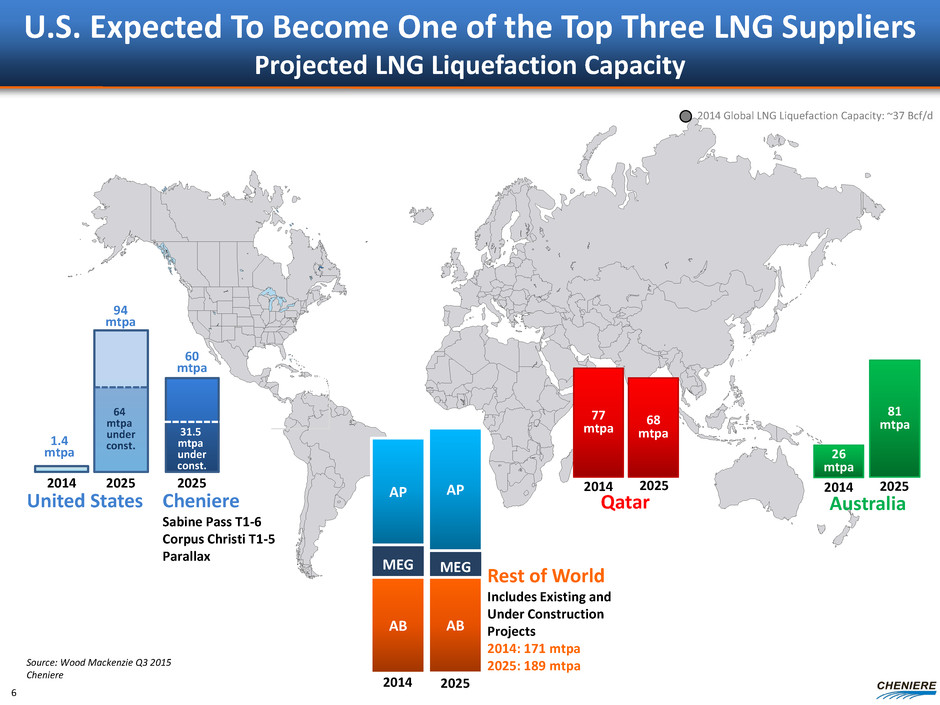 Projected Global LNG Demand 436 mtpa by 2025 22 19 23 2015 2020 2025 2015 2020 2025 6 10 17 2015 2020 2025 2015 2020 2025 Americas Asia Middle East/N. Africa 184 260 305 31 78 92 Europe Source: Wood Mackenzie Q3 2015 LNG Tool (1) Assumes 85% utilization of nameplate capacity Demand forecasted to increase by 193 mtpa to 2025, a 6% CAGR Average of 23 mtpa of new liquefaction capacity needed each year(1) 5