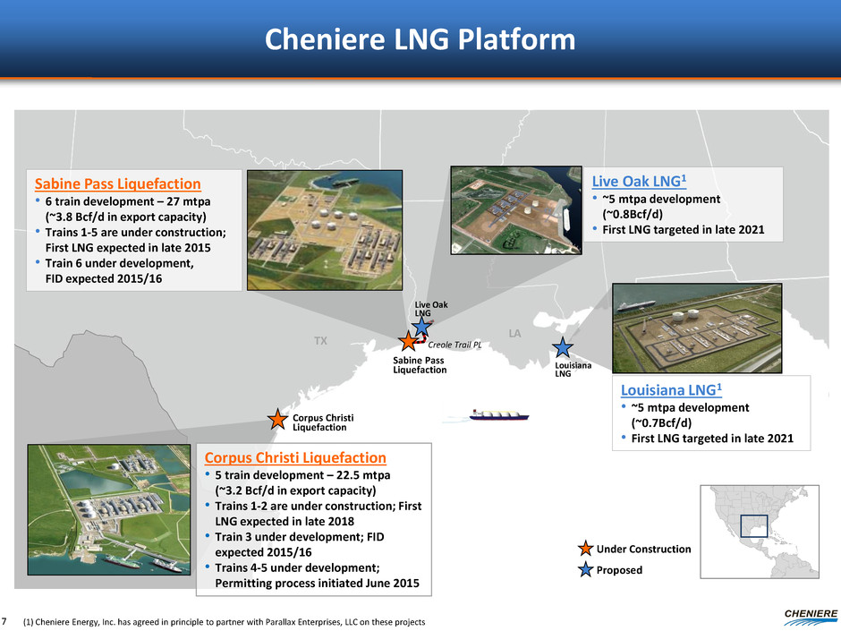 U.S. Expected To Become One of the Top Three LNG Suppliers Projected LNG Liquefaction Capacity 2014 Global LNG Liquefaction Capacity: ~37 Bcf/d 6 United States 77 mtpa 68 mtpa Qatar Source: Wood Mackenzie Q3 2015 Cheniere 2014 2025 2014 2025 2014 2025 MEG MEG Rest of World Includes Existing and Under Construction Projects 2014: 171 mtpa 2025: 189 mtpa AB 2014 2025 AB AP AP 1.4 mtpa 26 mtpa 81 mtpa Australia Cheniere Sabine Pass T1-6 Corpus Christi T1-5 Parallax 2025 64 mtpa under const. 31.5 mtpa under const. 94 mtpa 60 mtpa
