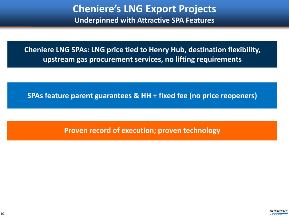Forecast Cheniere LNG Portfolio Summary Approximately 87% of LNG volumes for trains under construction are underpinned with LT SPAs, cash flows support current project debt of $21.5B 20-year LT SPAs with investment-grade counterparties For the balance of LNG volumes, long-term contracts are no longer required; Cheniere expects to sell LNG under shorter-term contracts or on a spot basis 9 SPL Trains 1-6 CCL Trains 1-3 Total CCL Trains 4-5 LO & LLNG1 Total Design Capacity 27.0 13.5 40.5 9.0 ~10 ~59.5 Under Construction (underpinned by LT SPAs) 22.5 (~88% sold) 9.0 (~85% sold) 31.5 (~87% sold) In Permitting In Permitting 31.5 (~87% sold) LT SPAs Target (sold to date) 21.25 (19.8 ) 10.5 (8.4) 31.75 (28.2) - - 31.75 (28.2) Excess Volumes: Customized Contracts/CMI 5.75 3.0 8.75 9.0 ~10 ~27.75 EBITDA is a non-GAAP measure. EBITDA is computed as total revenues less non-cash deferred revenues, operating expenses, assumed commissioning costs and state and local taxes. It does not include depreciation expenses and certain non-operating items. We have not made any forecast of net income, which would be the most comparable financial measure under GAAP, and we are unable to reconcile differences between forecasted EBITDA and net income. EBITDA has limitations as an analytical tool and should not be considered in isolation or in lieu of an analysis of our results as reported under GAAP, and should be evaluated only on a supplementary basis. (in MTPA) (1) Cheniere Energy, Inc. has agreed in principle to partner with Parallax Enterprises, LLC on these projects